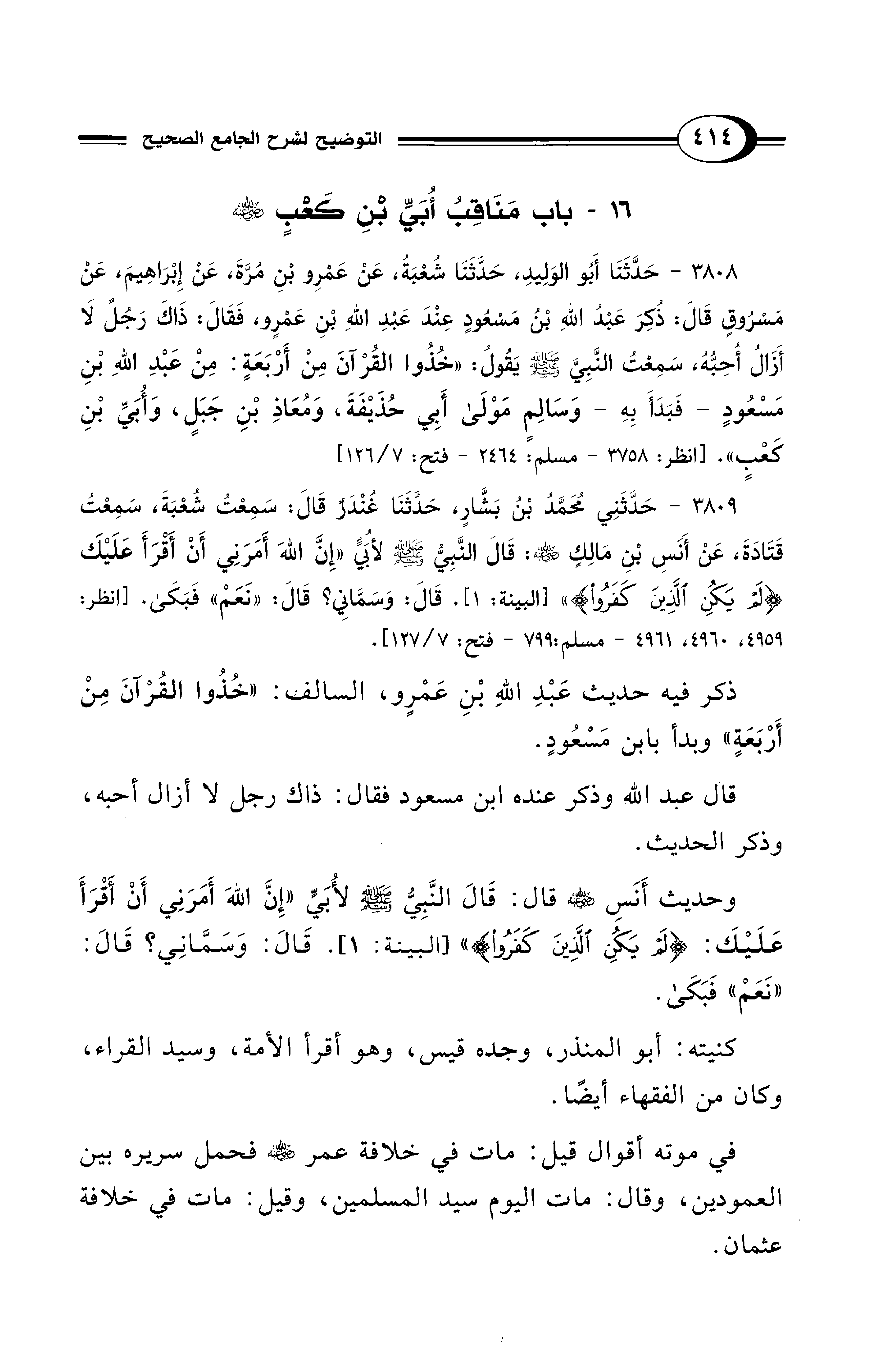 3808 - حَدَّثَنَا أَبُو الوَلِيدِ, حَدَّثَنَا شُعْبَةُ, عَنْ عَمْرِو بْنِ مُرَّةَ, عَنْ إِبْرَاهِيمَ, عَنْ مَسْرُوقٍ قَالَ: ذُكِرَ عَبْدُ اللهِ بْنُ مَسْعُودٍ عِنْدَ عَبْدِ اللهِ بْنِ عَمْرٍو, فَقَالَ: ذَاكَ رَجُلٌ لاَ أَزَالُ أُحِبُّهُ، سَمِعْتُ النَّبِيَّ - صلى الله عليه وسلم - يَقُولُ: «خُذُوا الْقُرْآنَ مِنْ أَرْبَعَةٍ: مِنْ عَبْدِ اللهِ بْنِ مَسْعُودٍ -فَبَدَأَ بِهِ- وَسَالِمٍ مَوْلَى أَبِي حُذَيْفَةَ، وَمُعَاذِ بْنِ جَبَلٍ، وَأُبَيِّ بْنِ كَعْبٍ». [انظر: 3758 - مسلم: 2464 - فتح: 7/ 126]