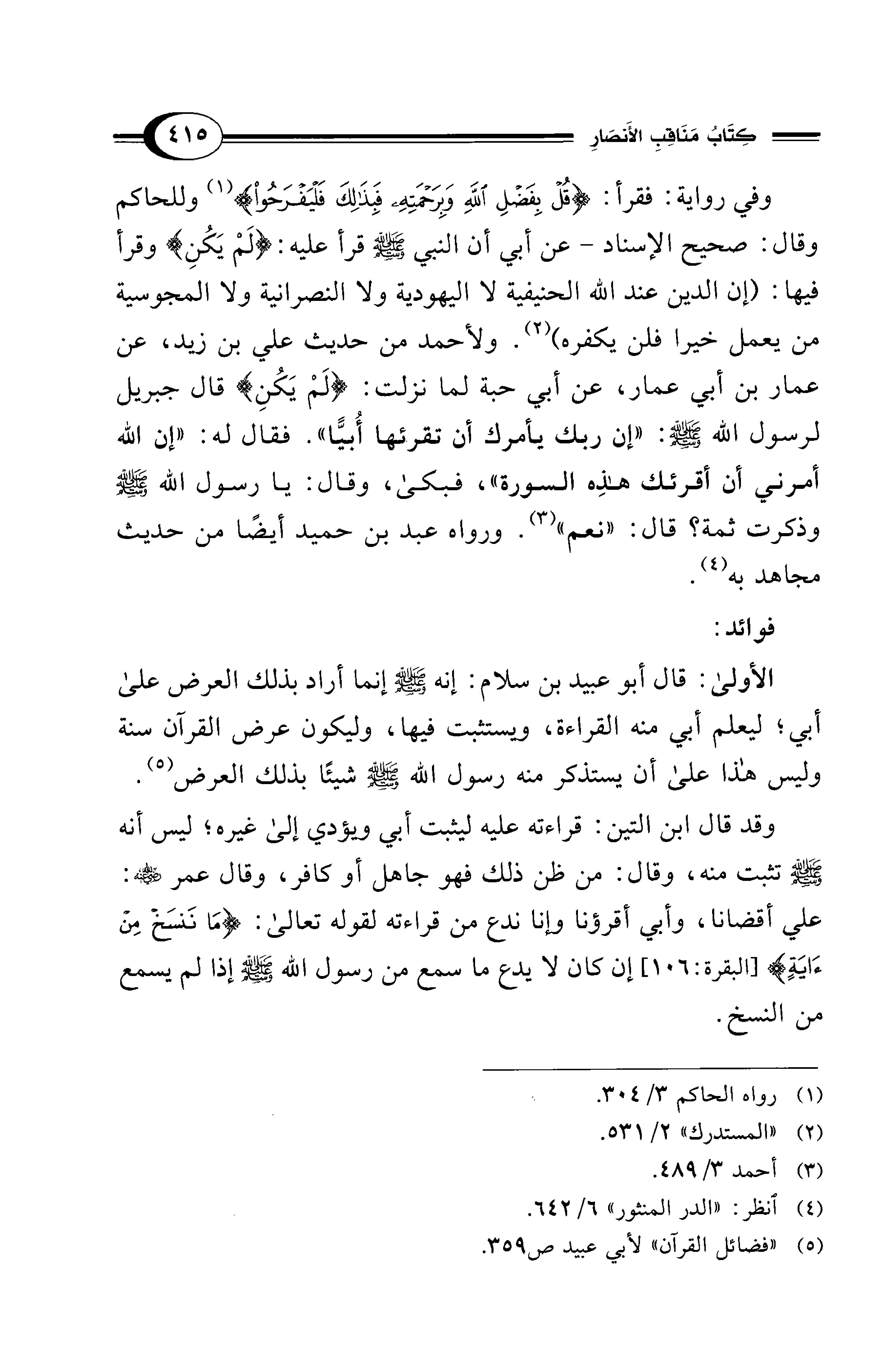 وفي رواية: فقرأ: {قُلْ بِفَضْلِ اللهِ وَبِرَحْمَتِهِ فَبِذَلِكَ فَلْيَفْرَحُوا} (¬1) وللحاكم وقال: صحيح الإسناد - عن أبي أن النبي - صلى الله عليه وسلم - قرأ عليه: {لَمْ يَكُنِ} وقرأ فيها: (إن الدين عند الله الحنيفية لا اليهودية ولا النصرانية ولا المجوسية من يعمل خيرا فلن يكفره) (¬2). ولأحمد من حديث علي بن زيد، عن عمار بن أبي عمار، عن أبي حبة لما نزلت: {لَمْ يَكُنِ} قال جبريل لرسول الله - صلى الله عليه وسلم -: "إن ربك يأمرك أن تقرئها أُبيًّا". فقال له: "إن الله أمرني أن أقرئك هذِه السورة"، فبكى، وقال: يا رسول الله - صلى الله عليه وسلم - وذكرت ثمة؟ قال: "نعم" (¬3). ورواه عبد بن حميد أيضًا من حديث مجاهد به (¬4).