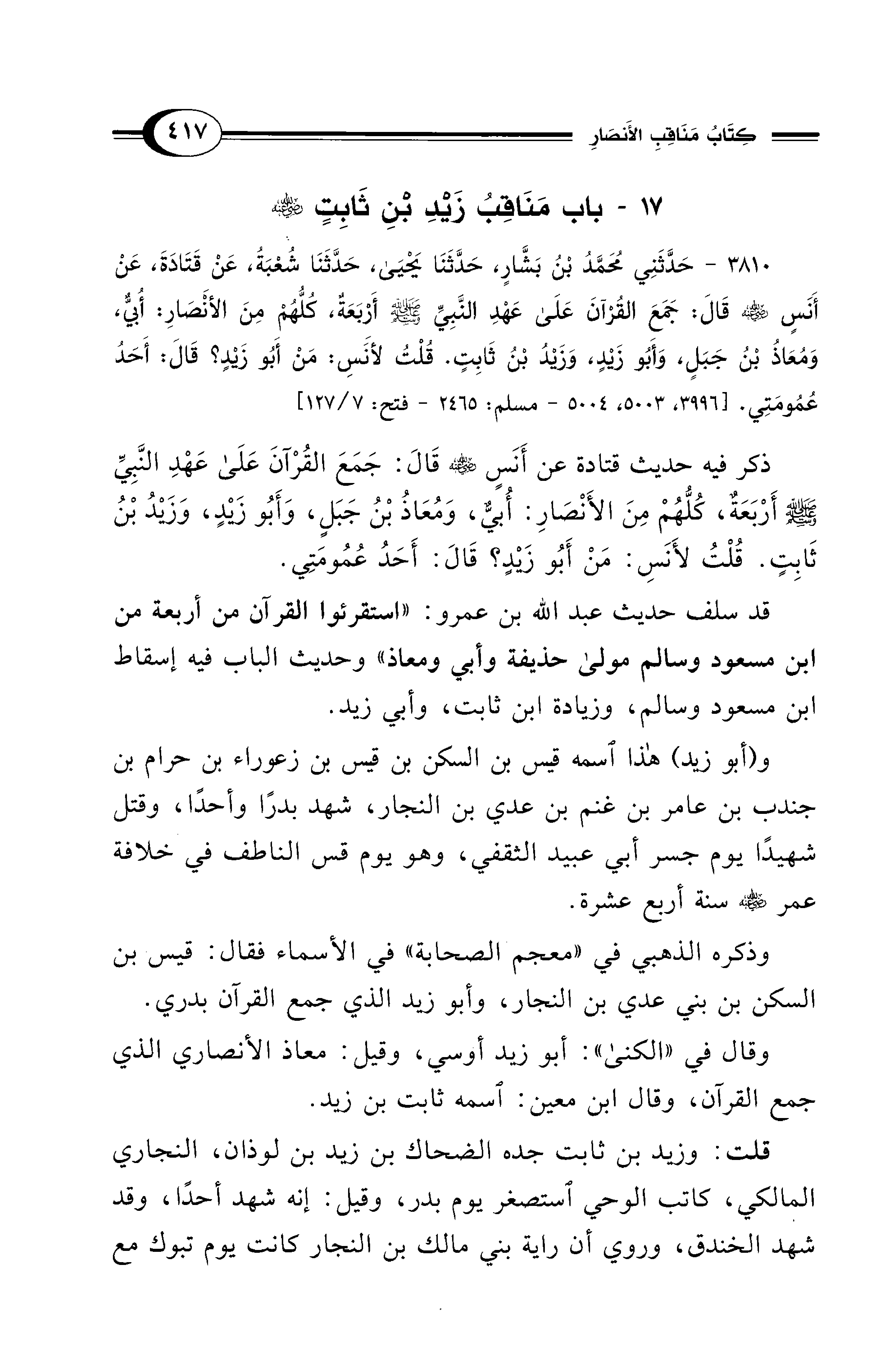3810 - حَدَّثَنِي مُحَمَّدُ بْنُ بَشَّارٍ, حَدَّثَنَا يَحْيَى, حَدَّثَنَا شُعْبَةُ, عَنْ قَتَادَةَ, عَنْ أَنَسٍ - رضي الله عنه - قَالَ: جَمَعَ الْقُرْآنَ عَلَى عَهْدِ النَّبِيِّ - صلى الله عليه وسلم - أَرْبَعَةٌ، كُلُّهُمْ مِنَ الأَنْصَارِ: أُبَيٌّ، وَمُعَاذُ بْنُ جَبَلٍ، وَأَبُو زَيْدٍ، وَزَيْدُ بْنُ ثَابِتٍ. قُلْتُ لأَنَسِ: مَنْ أَبُو زَيْدٍ؟ قَالَ: أَحَدُ عُمُومَتِي. [3996, 5003, 5004 - مسلم: 2465 - فتح: 7/ 127]