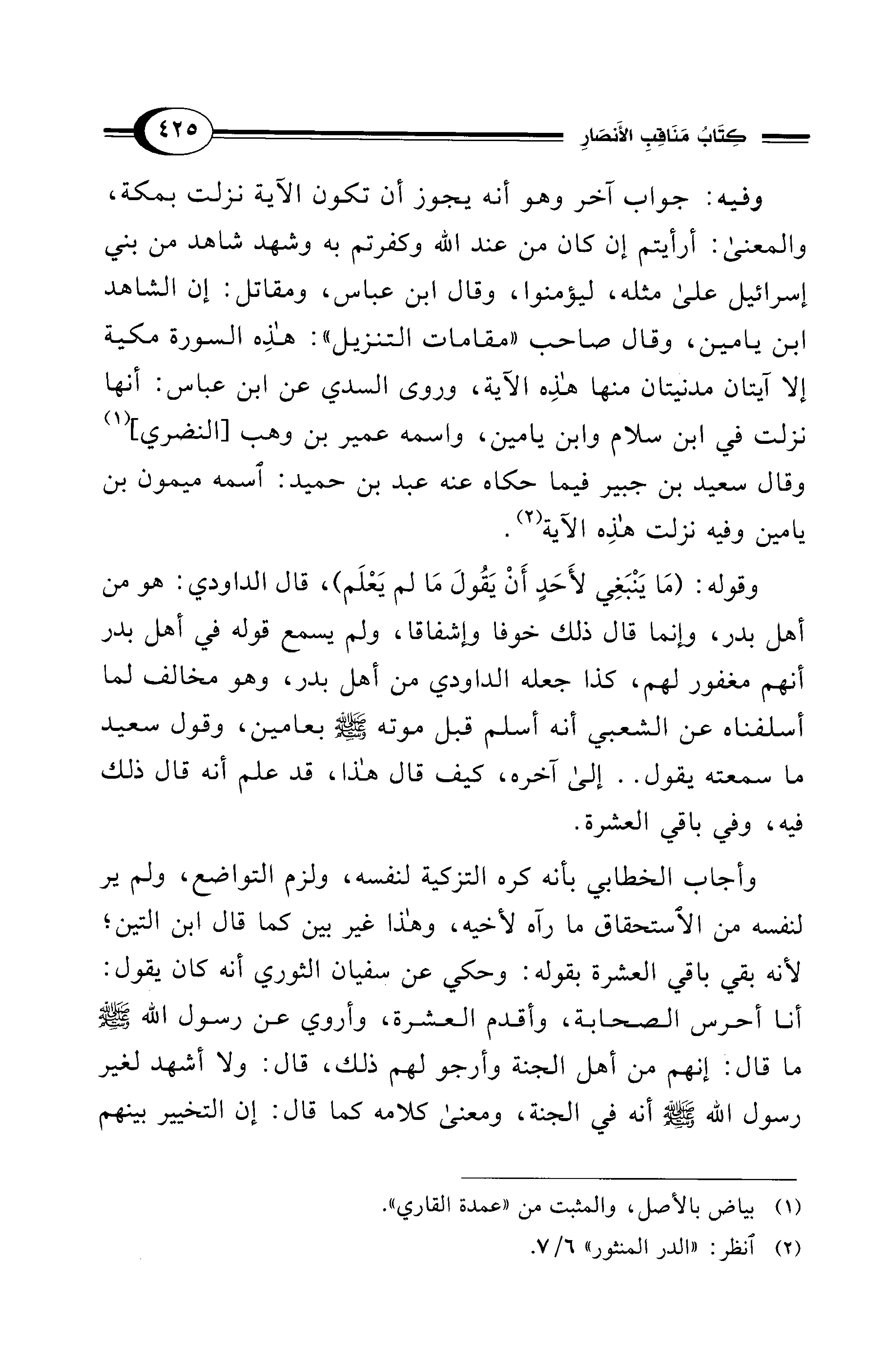 وأجاب الخطابي بأنه كره التزكية لنفسه، ولزم التواضع، ولم ير لنفسه من الاستحقاق ما رآه لأخيه، وهذا غير بين كما قال ابن التين؛ لأنه بقي باقي العشرة بقوله: وحكي عن سفيان الثوري أنه كان يقول: أنا أحرس الصحابة، وأقدم العشرة، وأروي عن رسول الله - صلى الله عليه وسلم - ما قال: إنهم من أهل الجنة وأرجو لهم ذلك، قال: ولا أشهد لغير رسول الله - صلى الله عليه وسلم - أنه في الجنة، ومعنى كلامه كما قال: إن التخيير بينهم