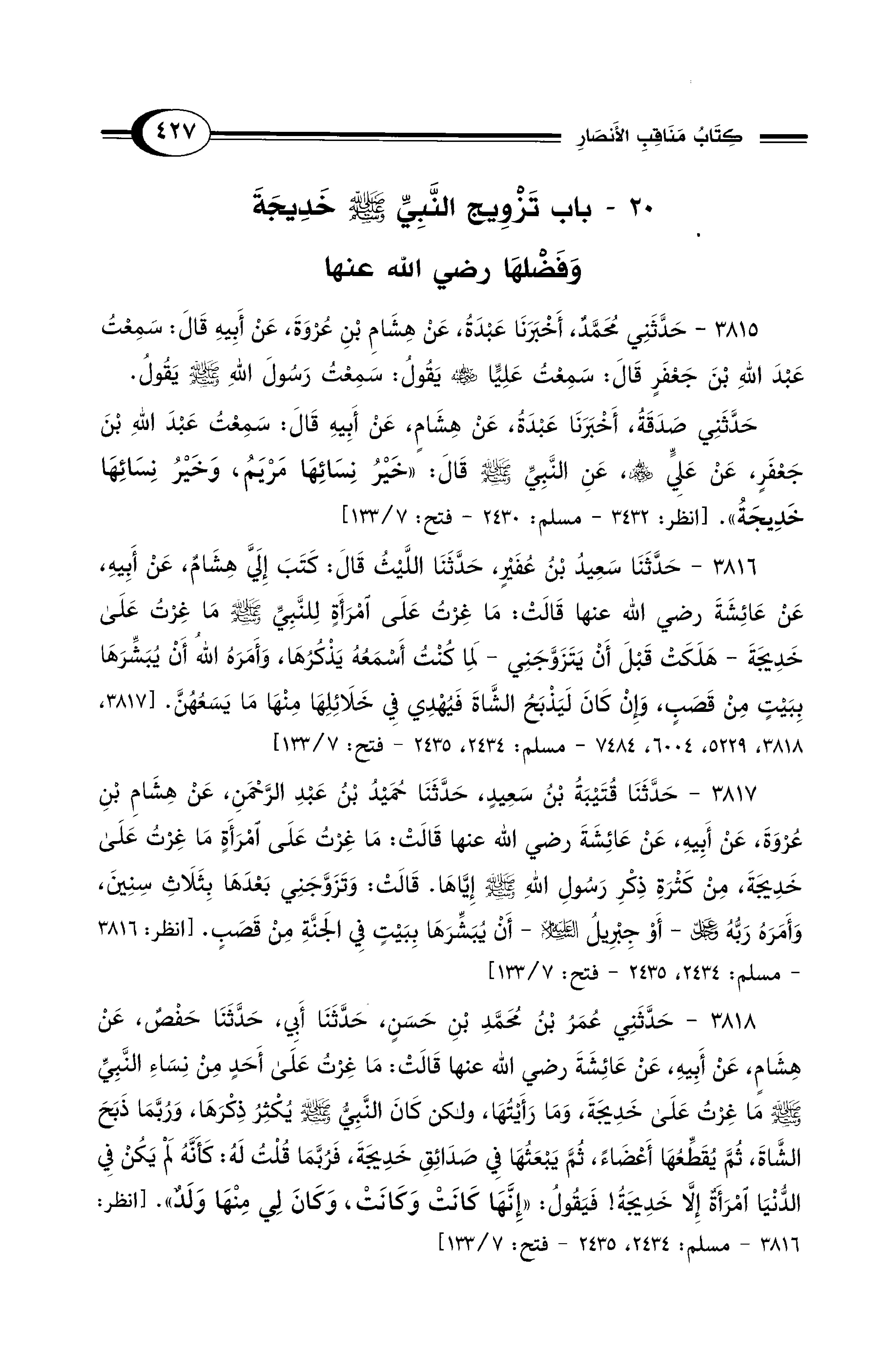 3817 - حَدَّثَنَا قُتَيْبَةُ بْنُ سَعِيدٍ, حَدَّثَنَا حُمَيْدُ بْنُ عَبْدِ الرَّحْمَنِ, عَنْ هِشَامِ بْنِ عُرْوَةَ, عَنْ أَبِيهِ, عَنْ عَائِشَةَ - رضي الله عنها -قَالَتْ: مَا غِرْتُ عَلَى امْرَأَةٍ مَا غِرْتُ عَلَى خَدِيجَةَ، مِنْ كَثْرَةِ ذِكْرِ رَسُولِ اللهِ - صلى الله عليه وسلم - إِيَّاهَا. قَالَتْ: وَتَزَوَّجَنِي بَعْدَهَا بِثَلاَثِ سِنِينَ، وَأَمَرَهُ رَبُّهُ -عَزَّ وَجَلَّ- أَوْ جِبْرِيلُ - عَلَيْهِ السَّلاَمُ - أَنْ يُبَشِّرَهَا بِبَيْتٍ فِي الجَنَّةِ مِنْ قَصَبٍ. [انظر: 3816 - مسلم: 2434, 2435 - فتح: 7/ 133]