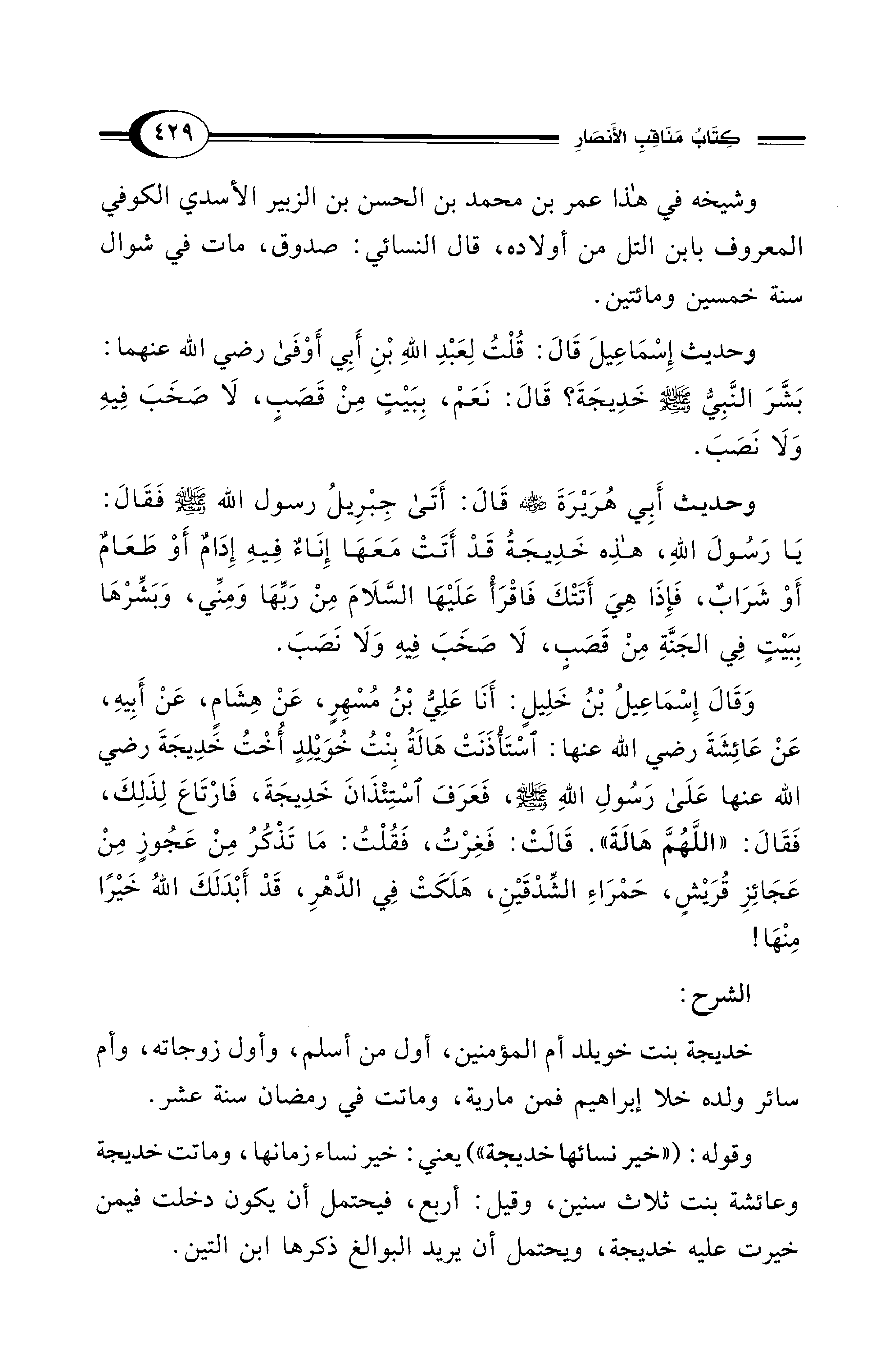 وحديث إِسْمَاعِيلَ قَالَ: قُلْتُ لِعَبْدِ اللهِ بْنِ أَبِي أَوْفَى - رضي الله عنهما -: بَشَّرَ النَّبِيُّ - صلى الله عليه وسلم - خَدِيجَةَ؟ قَالَ: نَعَمْ، بِبَيْتٍ مِنْ قَصَبٍ، لَا صَخَبَ فِيهِ وَلَا نَصَبَ.