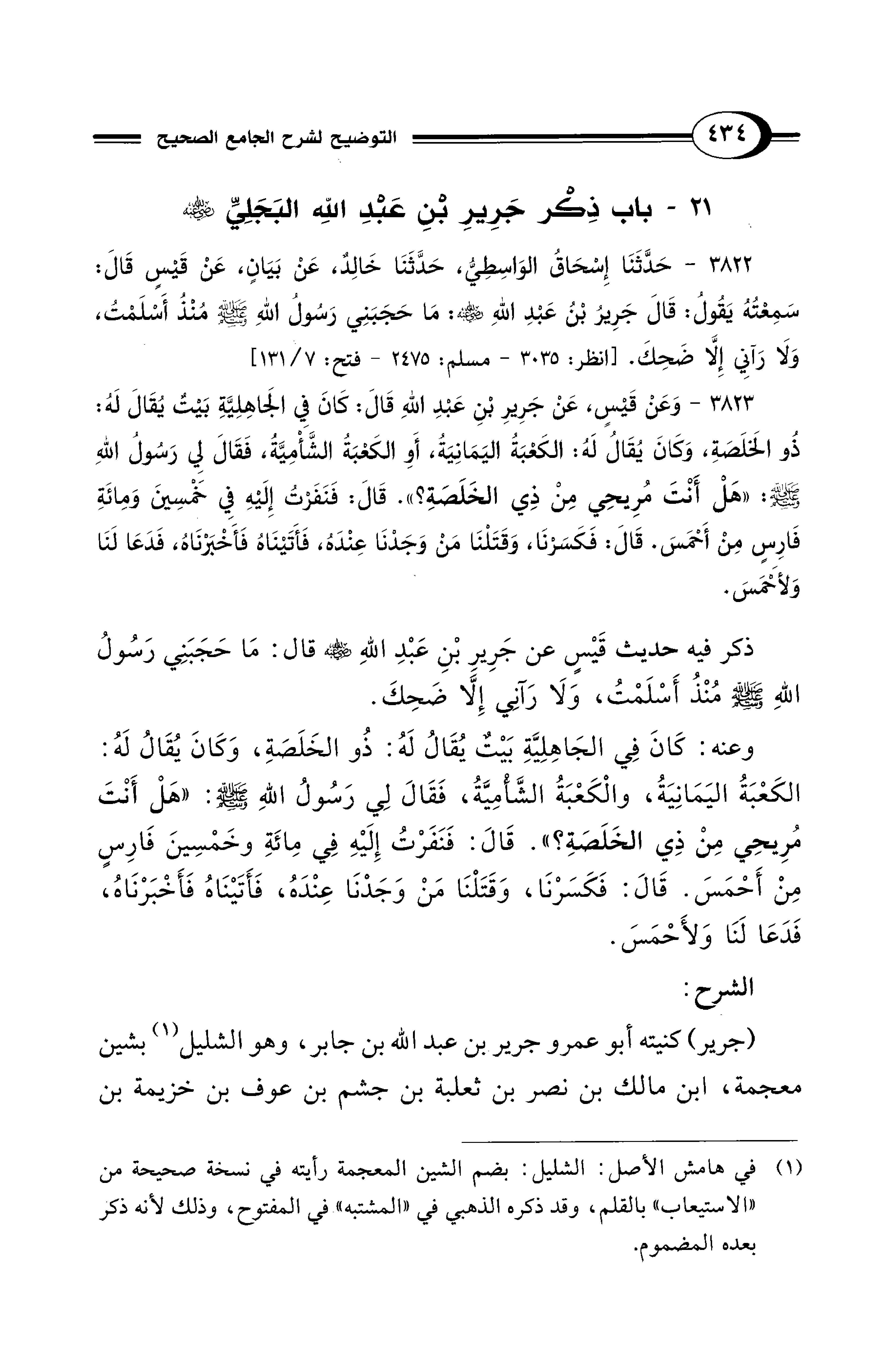 (جرير) كثيته أبو عمرو جرير بن عبد الله بن جابر، وهو الشليل (¬1) بشين معجمة، ابن مالك بن نصر بن ثعلبة بن جشم بن عوف بن خزيمة بن