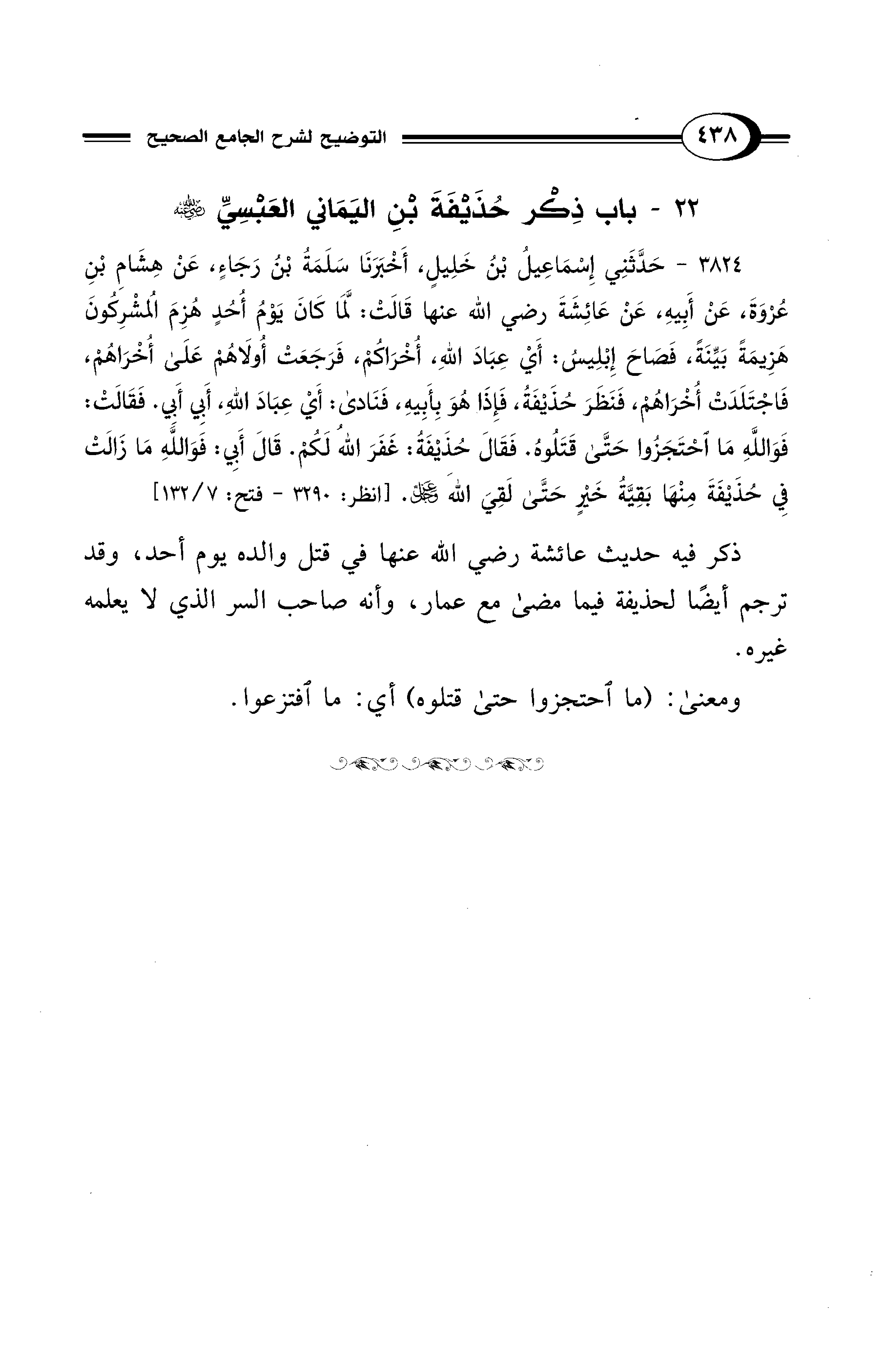 ذكر فيه حديث عائشة - رضي الله عنها - في قتل والده يوم أحد، وقد ترجم أيضًا لحذيفة فيما مضى مع عمار، وأنه صاحب السر الذي لا يعلمه غيره.