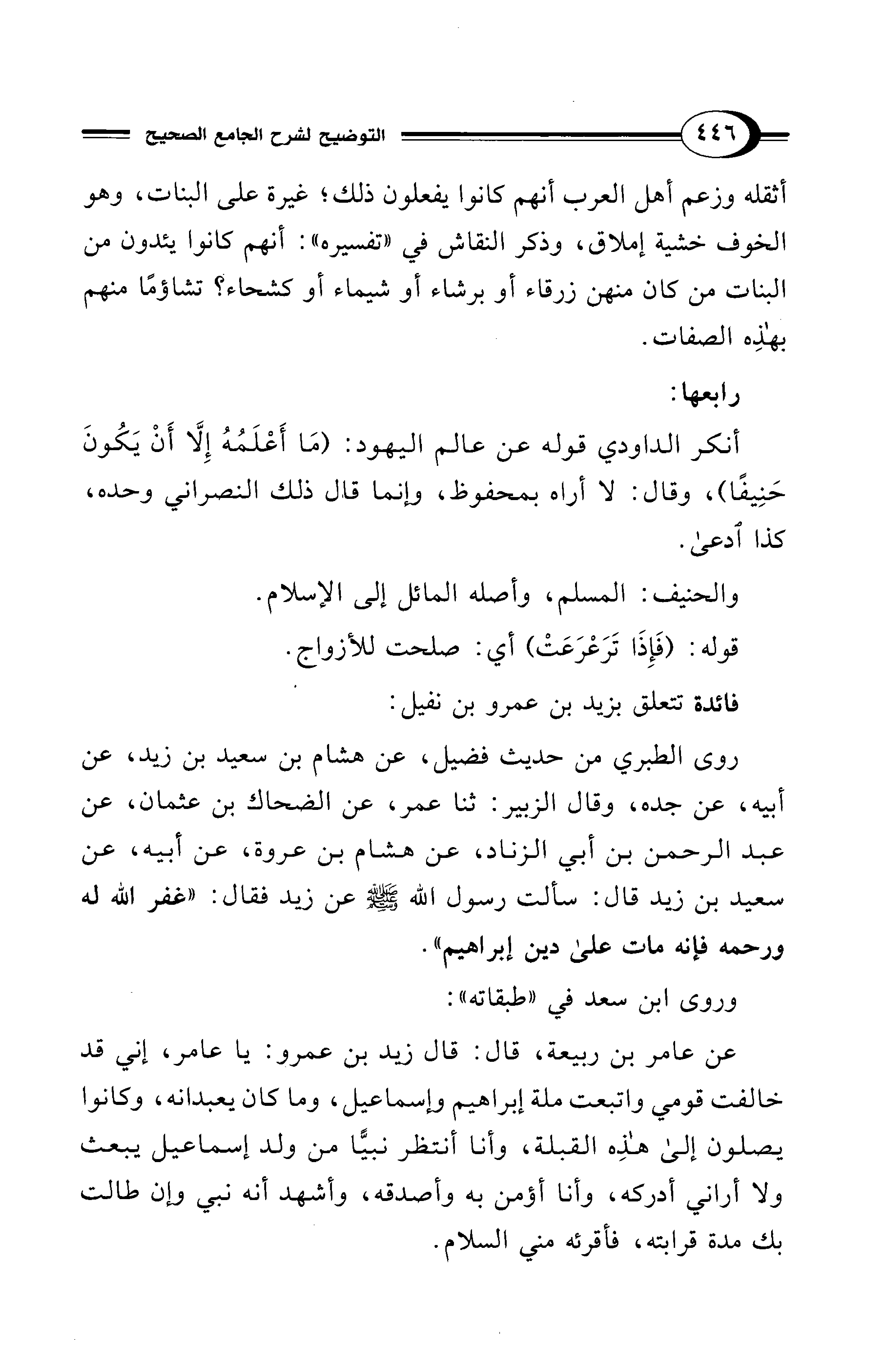 عن عامر بن ربيعة، قال: قال زيد بن عمرو: يا عامر، إني قد خالفت قومي واتبعت ملة إبراهيم وإسماعيل، وما كان يعبدانه، وكانوا يصلون إلى هذِه القبلة، وأنا أنتظر نبيًّا من ولد إسماعيل يبعث ولا أراني أدركه، وأنا أؤمن به وأصدقه، وأشهد أنه نبي وإن طالت بك مدة قرابته، فأقرئه مني السلام.