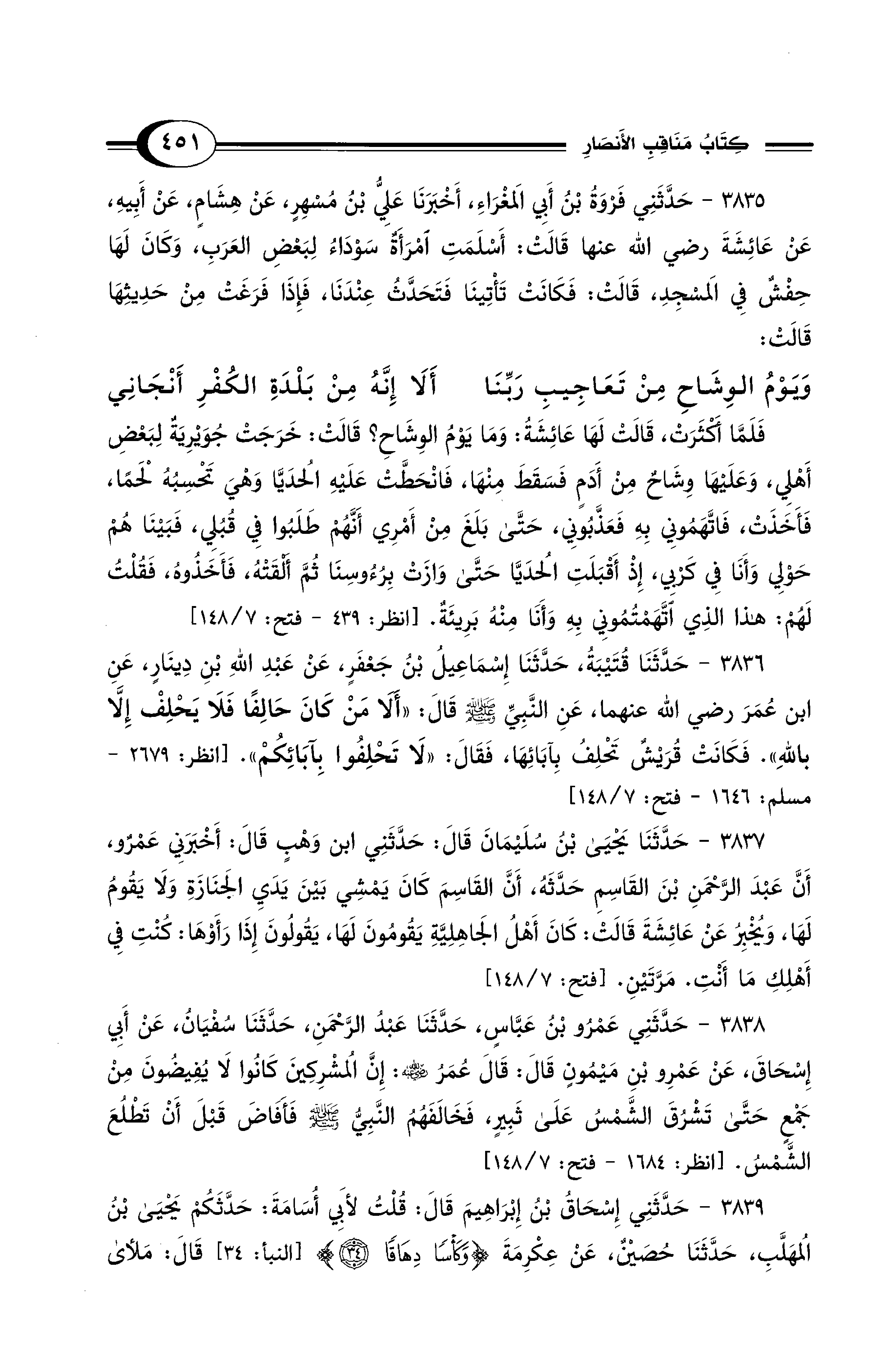 3835 - حَدَّثَنِي فَرْوَةُ بْنُ أَبِي المَغْرَاءِ, أَخْبَرَنَا عَلِيُّ بْنُ مُسْهِرٍ, عَنْ هِشَامٍ, عَنْ أَبِيهِ, عَنْ عَائِشَةَ - رضي الله عنها - قَالَتْ: أَسْلَمَتِ امْرَأَةٌ سَوْدَاءُ لِبَعْضِ العَرَبِ، وَكَانَ لَهَا حِفْشٌ فِي المَسْجِدِ قَالَتْ: فَكَانَتْ تَأْتِينَا فَتَحَدَّثُ عِنْدَنَا, فَإِذَا فَرَغَتْ مِنْ حَدِيثِهَا قَالَتْ: