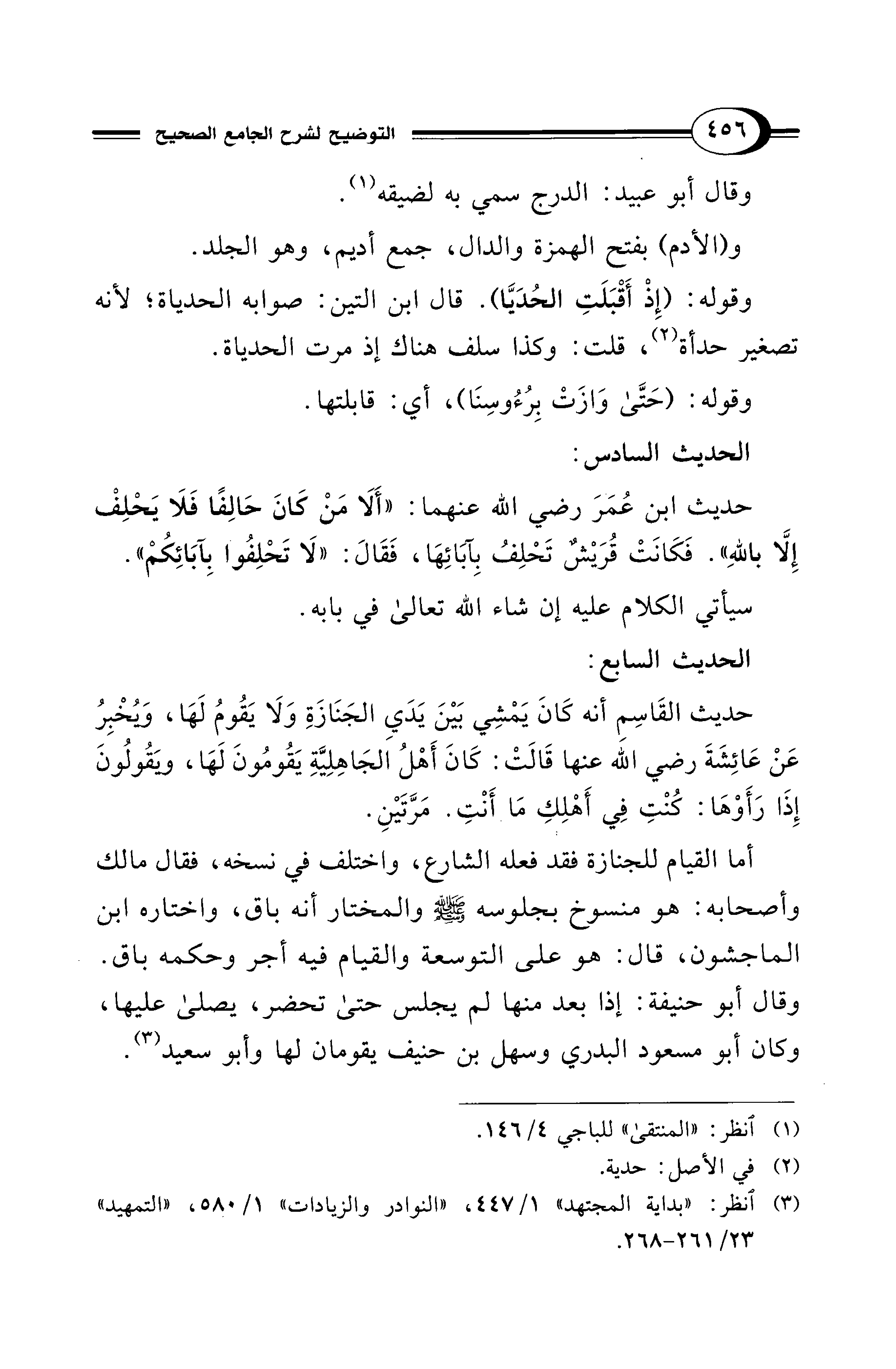 حديث القَاسِمِ أنه كَانَ يَمْشِي بَيْنَ يَدَيِ الجَنَازَةِ وَلَا يَقُومُ لَهَا، وَيُخْبِرُ عَنْ عَائِشَةَ - رضي الله عنها - قَالَتْ: كَانَ أَهْلُ الجَاهِلِيَّةِ يَقُومُونَ لَهَا، ويَقُولُونَ إِذَا رَأَوْهَا: كُنْتِ فِي أَهْلِكِ مَا أَنْتِ. مَرَّتَيْنِ.