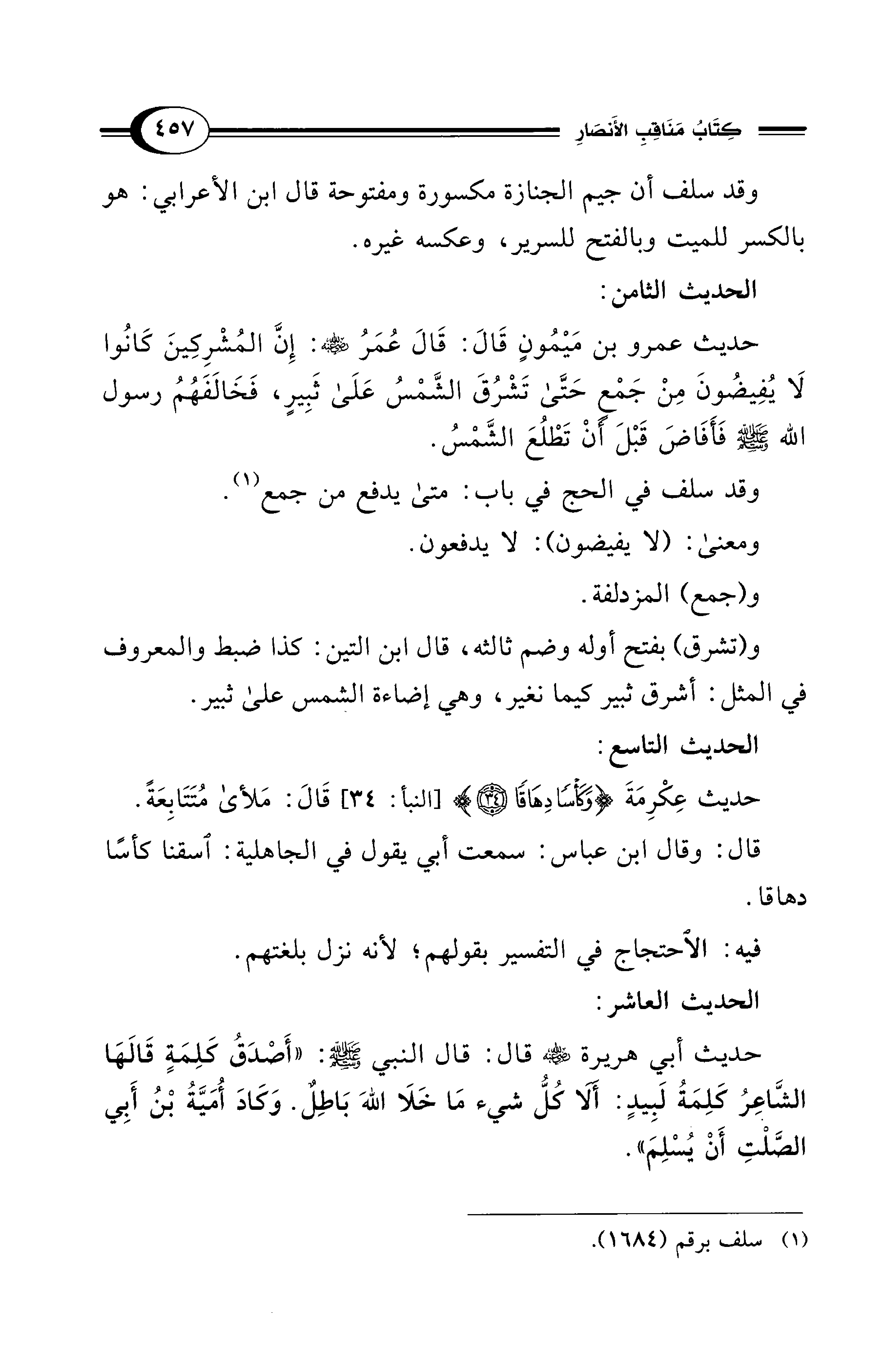 حديث عمرو بن مَيْمُونٍ قَالَ: قَالَ عُمَرُ - رضي الله عنه -: إِنَّ المُشْرِكِينَ كَانُوا لَا يُفِيضُونَ مِنْ جَمْع حَتَّى تَشْرُقَ الشَّمْسُ عَلَى ثَبِيرٍ، فَخَالَفَهُمُ رسول الله - صلى الله عليه وسلم - فَأَفَاضَ قَبْلَ انْ تَطْلُعَ الشَّمْسُ.