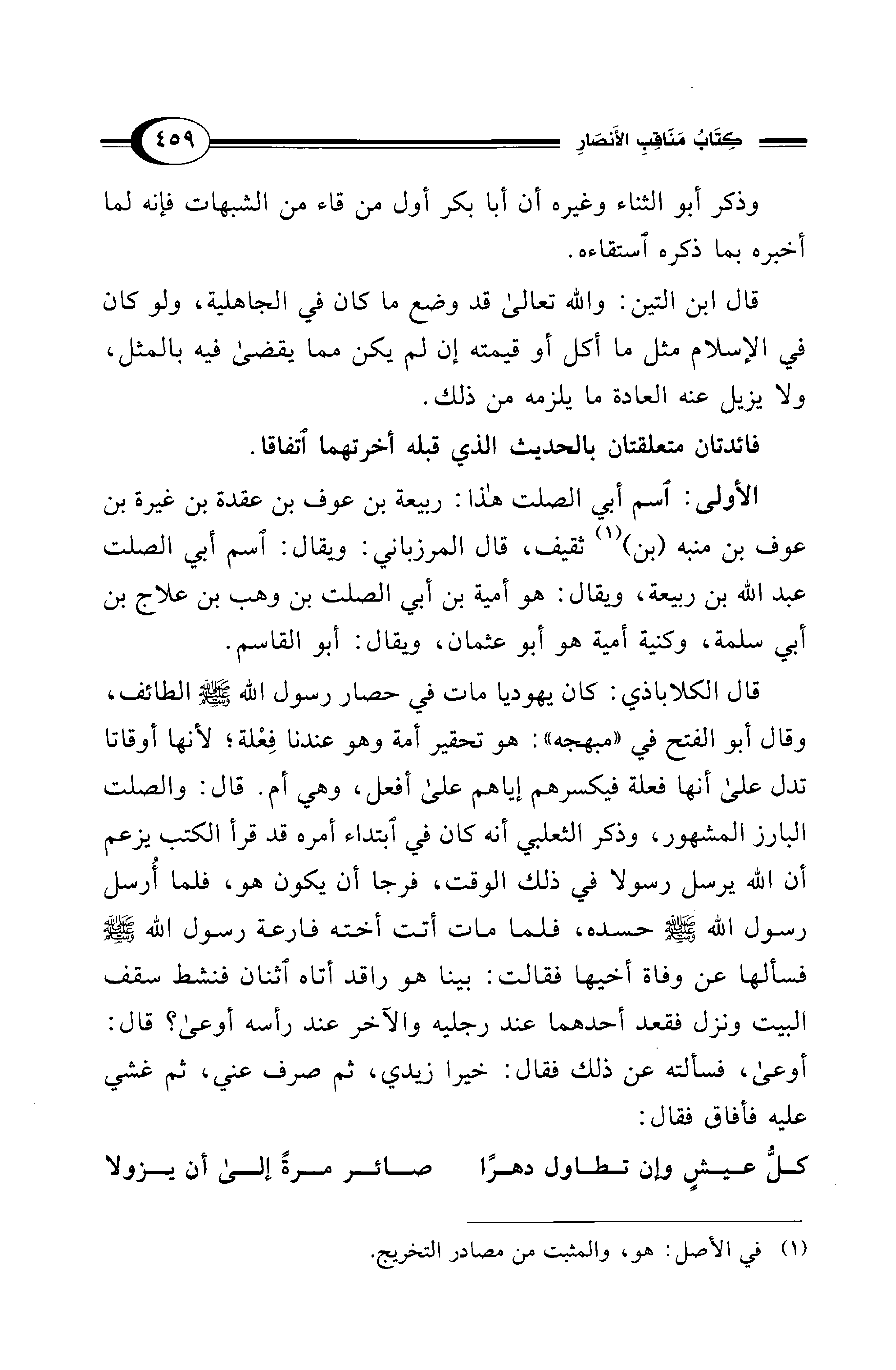 الأولى: اسم أبي الصلت هذا: ربيعة بن عوف بن عقدة بن غيرة بن عوف بن منبه (بن) (¬1) ثقيف، قال المرزباني: ويقال: اسم أبي الصلت عبد الله بن ربيعة، ويقال: هو أمية بن أبي الصلت بن وهب بن علاج بن أبي سلمة، وكنية أمية هو أبو عثمان، ويقال: أبو القاسم.