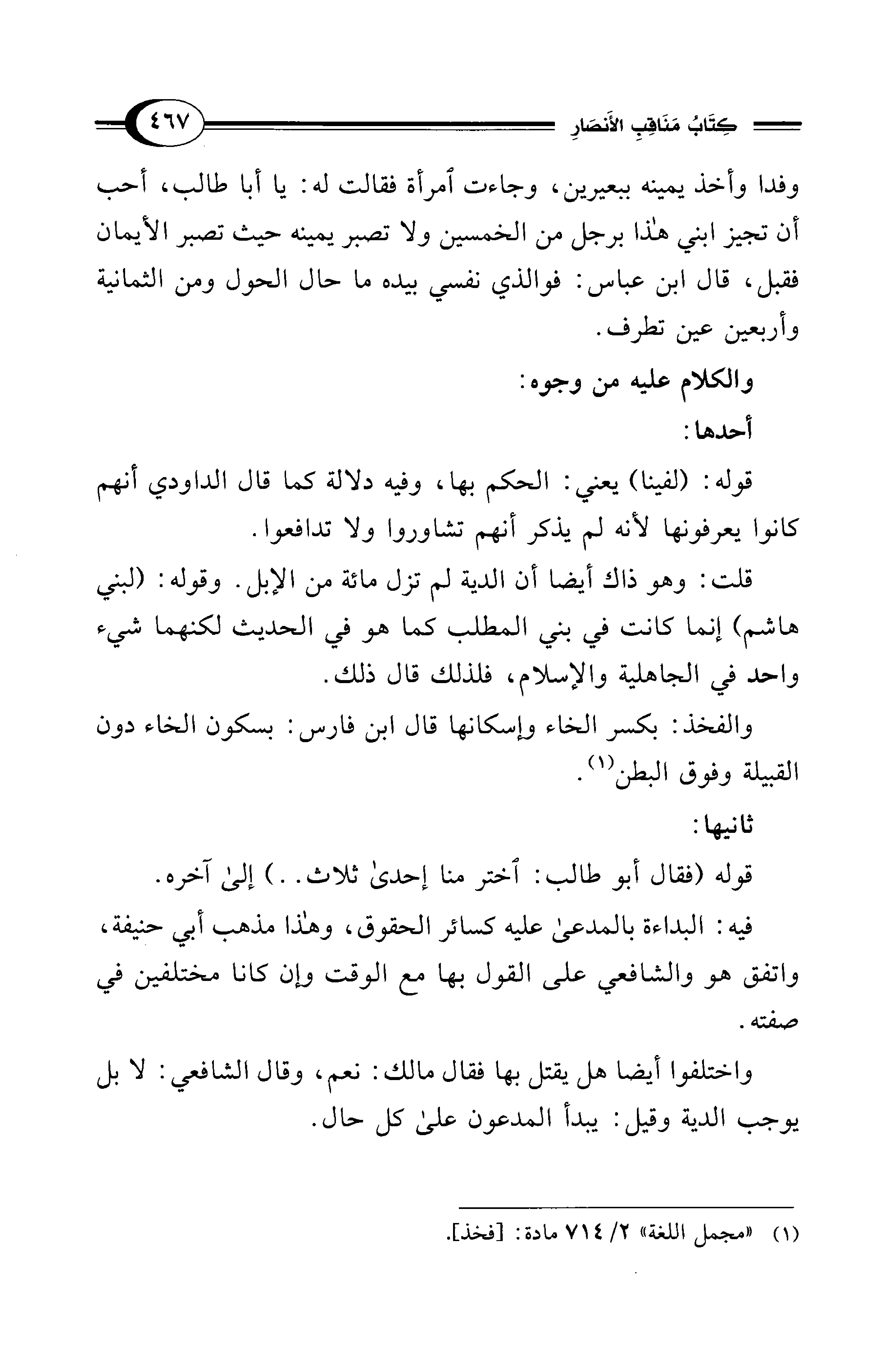 وفدا وأخذ يمينه ببعيرين، وجاءت امرأة فقالت له: يا أبا طالب، أحب أن تجيز ابني هذا برجل من الخمسين ولا تصبر يمينه حيث تصبر الأيمان فقبل، قال ابن عباس: فوالذي نفسي بيده ما حال الحول ومن الثمانية وأربعين عين تطرف.