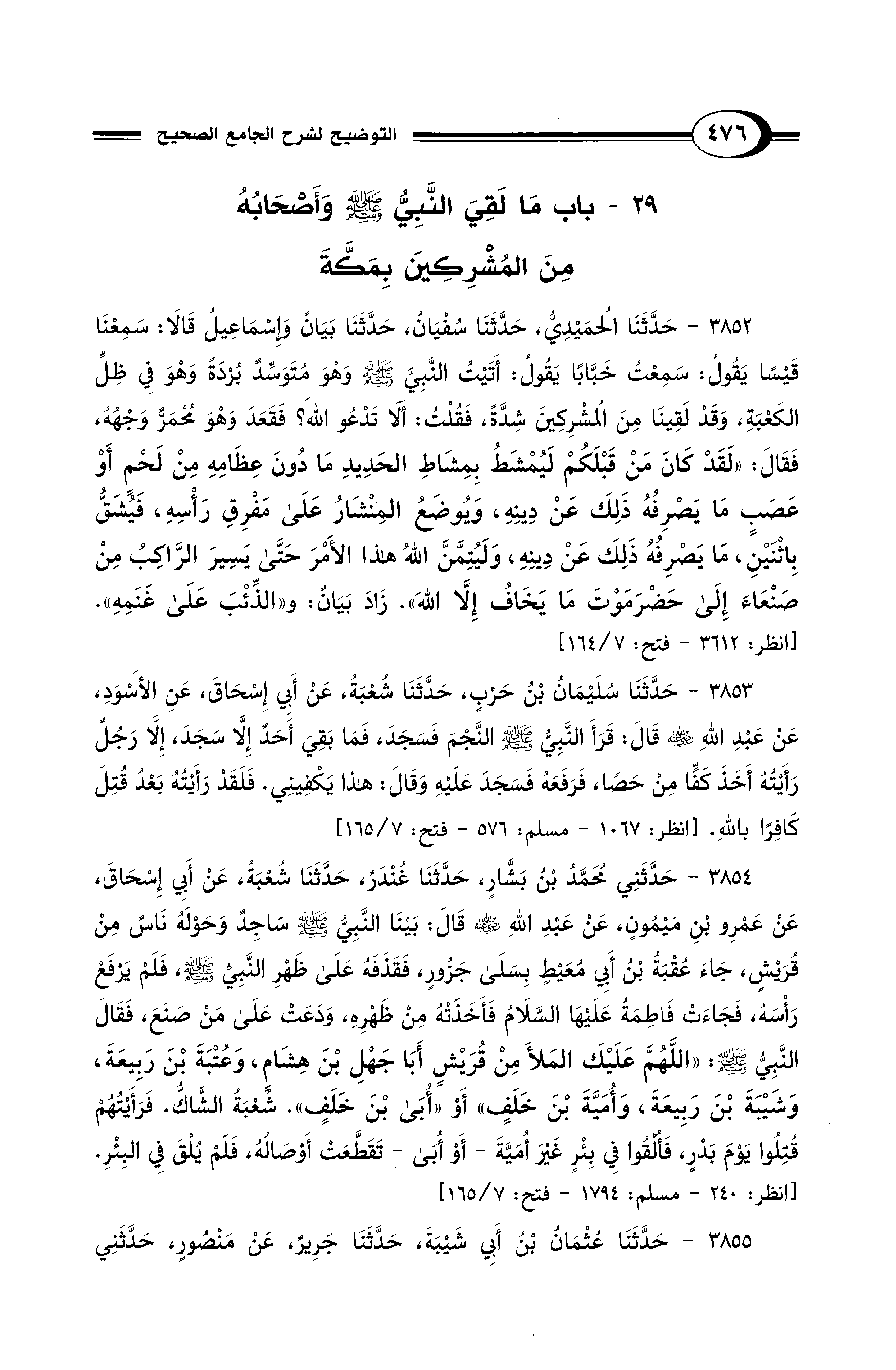 3854 - حَدَّثَنِى مُحَمَّدُ بْنُ بَشَّارٍ, حَدَّثَنَا غُنْدَرٌ, حَدَّثَنَا شُعْبَةُ, عَنْ أَبِى إِسْحَاقَ, عَنْ عَمْرِو بْنِ مَيْمُونٍ, عَنْ عَبْدِ اللَّهِ - رضى الله عنه - قَالَ: بَيْنَا النَّبِيُّ - صلى الله عليه وسلم - سَاجِدٌ وَحَوْلَهُ نَاسٌ مِنْ قُرَيْشٍ, جَاءَ عُقْبَةُ بْنُ أَبِى مُعَيْطٍ بِسَلَى جَزُورٍ، فَقَذَفَهُ عَلَى ظَهْرِ النَّبِيِّ - صلى الله عليه وسلم -، فَلَمْ يَرْفَعْ رَأْسَهُ, فَجَاءَتْ فَاطِمَةُ - عَلَيْهَا السَّلاَمُ - فَأَخَذَتْهُ مِنْ ظَهْرِهِ، وَدَعَتْ عَلَى مَنْ صَنَعَ, فَقَالَ النَّبِىُّ - صلى الله عليه وسلم -: «اللَّهُمَّ عَلَيْكَ الْمَلأَ مِنْ قُرَيْشٍ أَبَا جَهْلِ بْنَ هِشَامٍ، وَعُتْبَةَ بْنَ رَبِيعَةَ، وَشَيْبَةَ بْنَ رَبِيعَةَ، وَأُمَيَّةَ بْنَ خَلَفٍ - أَوْ أُبَيَّ بْنَ خَلَفٍ». شُعْبَةُ الشَّاكُّ - فَرَأَيْتُهُمْ قُتِلُوا يَوْمَ بَدْرٍ، فَأُلْقُوا فِى بِئْرٍ غَيْرَ أُمَيَّةَ - أَوْ أُبَيٍّ - تَقَطَّعَتْ أَوْصَالُهُ، فَلَمْ يُلْقَ فِى الْبِئْرِ. [انظر: 240 - مسلم: 1794 - فتح: 7/ 165]