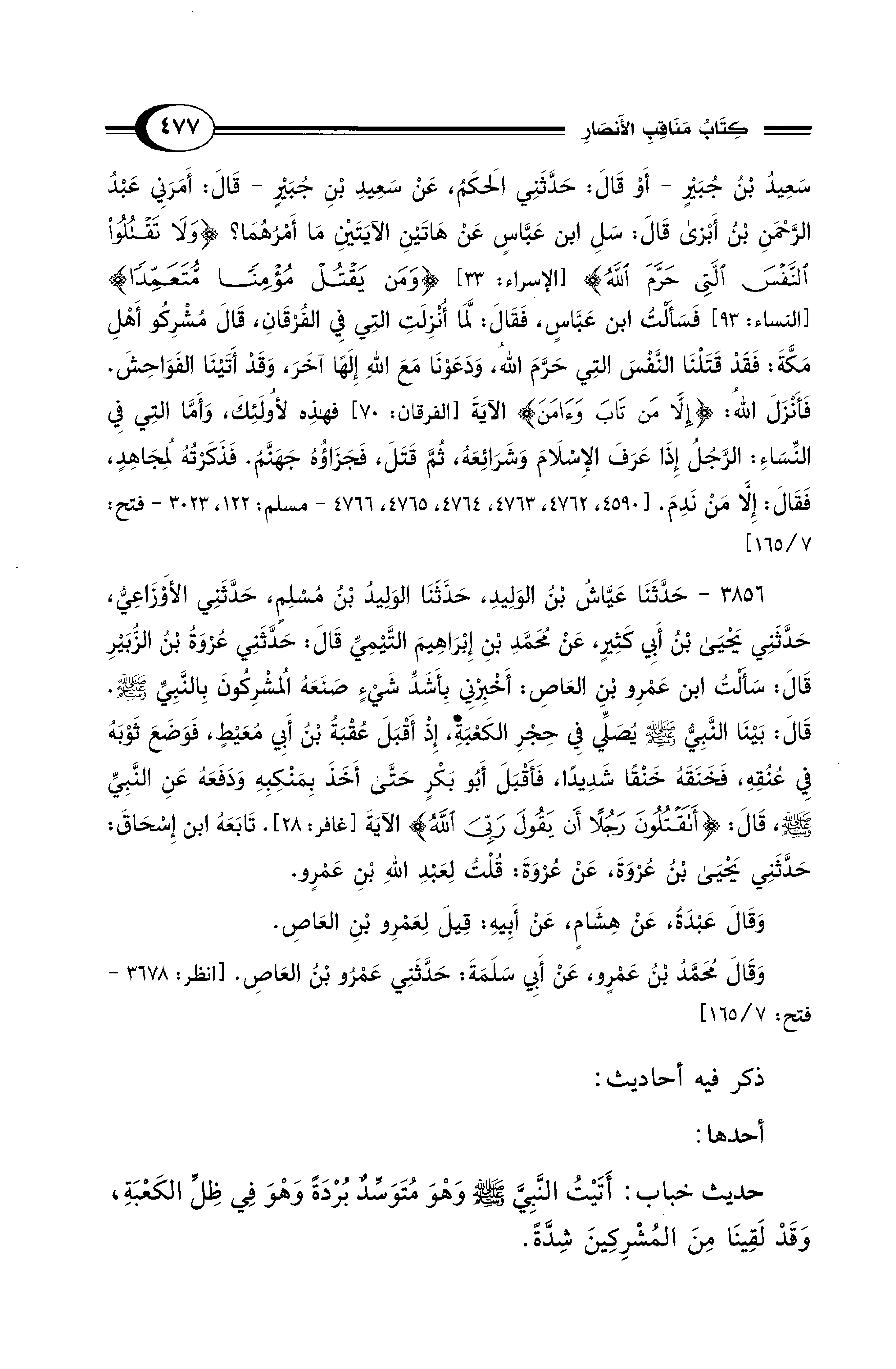 سَعِيدُ بْنُ جُبَيْرٍ أَوْ قَالَ حَدَّثَنِي الْحَكَمُ, عَنْ سَعِيدِ بْنِ جُبَيْرٍ - قَالَ أَمَرَنِي عَبْدُ الرَّحْمَنِ بْنُ أَبْزَى قَالَ: سَلِ ابْنَ عَبَّاسٍ عَنْ هَاتَيْنِ الآيَتَيْنِ مَا أَمْرُهُمَا؟ {وَلَا تَقْتُلُوا النَّفْسَ الَّتِي حَرَّمَ اللَّهُ} [الإسراء: 33] {وَمَنْ يَقْتُلْ مُؤْمِنًا مُتَعَمِّدًا} [النساء: 93] فَسَأَلْتُ ابْنَ عَبَّاسٍ, فَقَالَ: لَمَّا أُنْزِلَتِ الَّتِى فِى الْفُرْقَانِ, قَالَ مُشْرِكُو أَهْلِ مَكَّةَ فَقَدْ قَتَلْنَا النَّفْسَ الَّتِي حَرَّمَ اللَّهُ,، وَدَعَوْنَا مَعَ اللَّهِ إِلَهًا آخَرَ، وَقَدْ أَتَيْنَا الْفَوَاحِشَ. فَأَنْزَلَ اللَّهُ {إِلَّا مَنْ تَابَ وَآمَنَ} [الفرقان: 70] الآيَةَ فَهَذِهِ لأُولَئِكَ, وَأَمَّا الَّتِي فِى النِّسَاءِ الرَّجُلُ إِذَا عَرَفَ الإِسْلاَمَ وَشَرَائِعَهُ، ثُمَّ قَتَلَ, فَجَزَاؤُهُ جَهَنَّمُ. فَذَكَرْتُهُ لِمُجَاهِدٍ, فَقَالَ: إِلاَّ مَنْ نَدِمَ. [4590, 4762, 4763, 4764, 4765, 4766 - مسلم: 122, 3023 - فتح: 7/ 165]