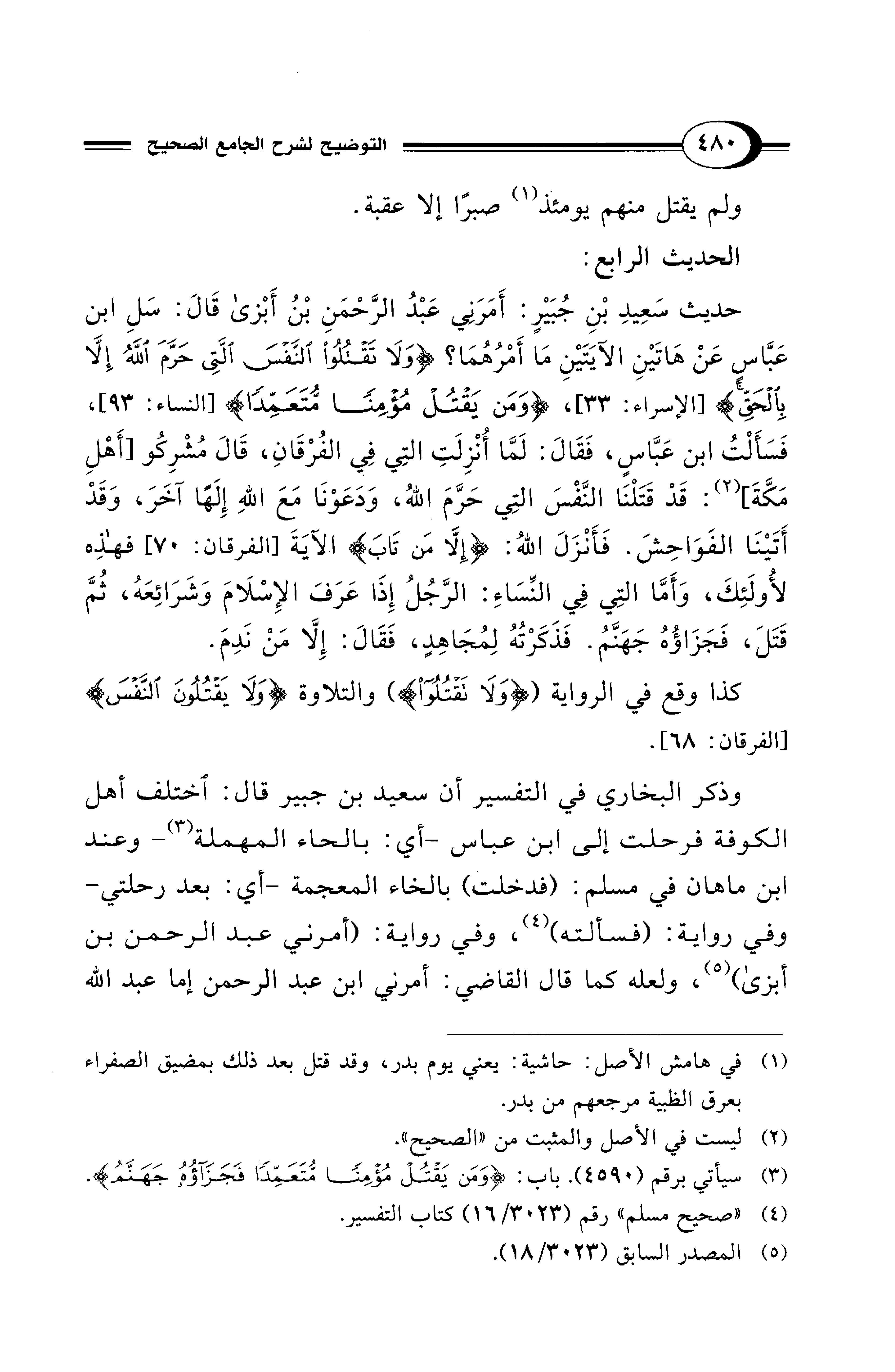 حديث سَعِيدِ بْنِ جُبَيْرٍ: أَمَرَنِي عَبْدُ الرَّحْمَنِ بْنُ أَبْزى قَالَ: سَلِ ابن عَبَّاس عَنْ هَاتَيْنِ الآيَتَيْنِ مَا أَمْرُهُمَا؟ {وَلَا تَقْتُلُوا النَّفْسَ الَّتِي حَرَّمَ اللَّهُ إِلَّا بِالْحَقِّ} [الإسراء: 33]، {وَمَنْ يَقْتُلْ مُؤْمِنًا مُتَعَمِّدًا} [النساء: 93]، فَسَأَلْتُ ابن عَبَّاسٍ، فَقَالَ: لَمَّا أُنْزِلَتِ التِي في الفُرْقَانِ، قَالَ مُشْرِكُو [أَهْلِ مَكَّةَ] (¬2): قَدْ قَتَلْنَا النَّفْسَ التِي حَرَّمَ اللهُ، وَدَعَوْنَا مَعَ اللهِ إِلَهًا آخَرَ، وَقَدْ أَتَيْنَا الفَوَاحِشَ. فَأَنْزَلَ اللهُ: {إِلَّا مَنْ تَابَ} الآيَةَ [الفرقان: 70]، فهذِه لأُولَئِكَ، وَأَمَّا التِي فِي النِّسَاءِ: الرَّجُلُ إِذَا عَرَفَ الإِسْلَامَ وَشَرَائِعَهُ، ثُمَّ قَتَلَ، فَجَزَاور جَهَنَّمُ. فَذَكَرْتُهُ لِمُجَاهِدٍ، فَقَالَ: إِلَّا مَنْ نَدِمَ.