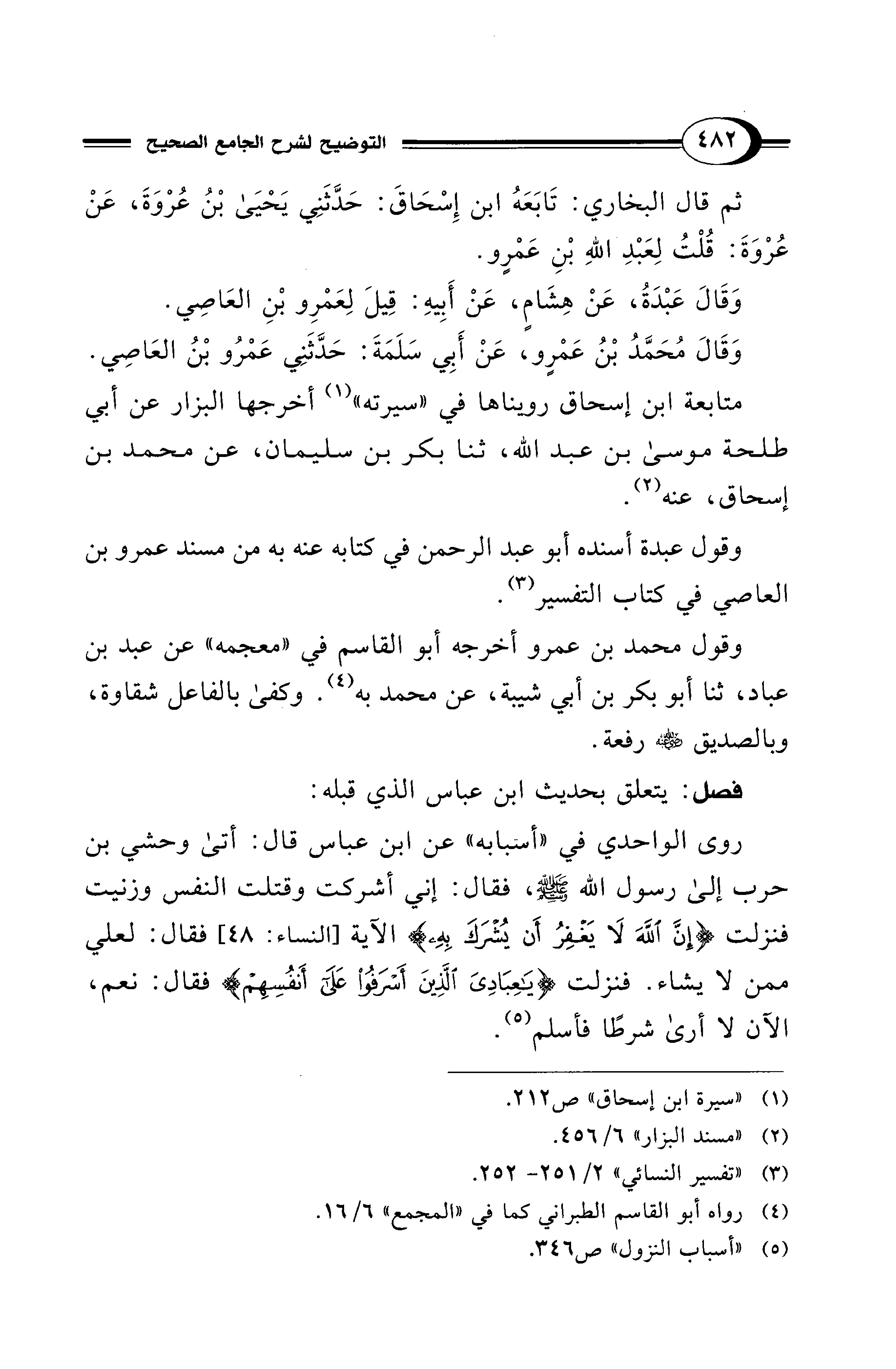 ثم قال البخاري: تَابَعَهُ ابن إِسْحَاقَ: حَدَّثَنِي يَحْيَى بْنُ عُرْوَةَ، عَنْ عُرْوَةَ: قُلْتُ لِعَبْدِ اللهِ بْنِ عَمْرٍو.