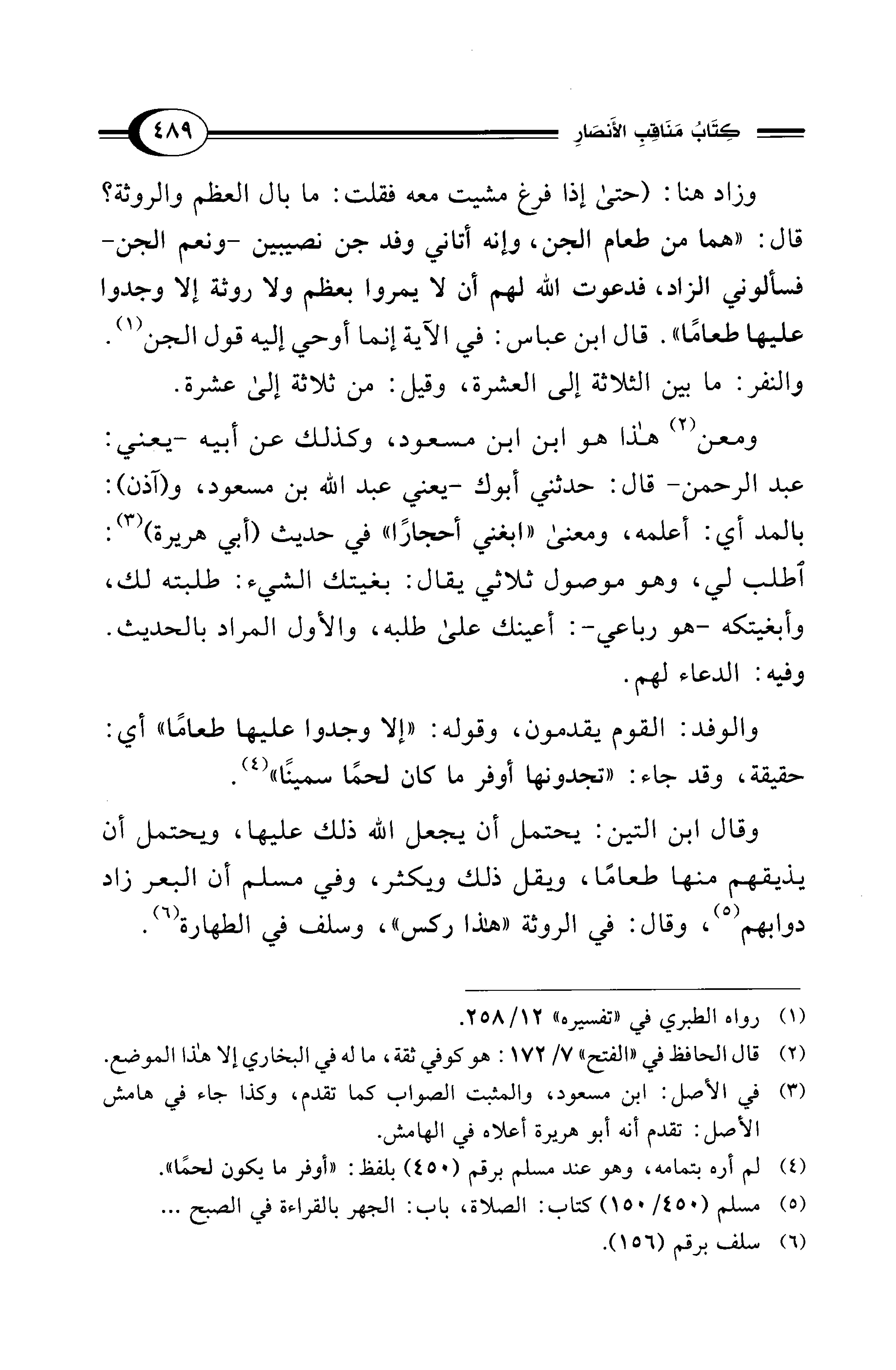 وزاد هنا: (حتى إذا فرغ مشيت معه فقلت: ما بال العظم والروثة؟ قال: "هما من طعام الجن، وإنه أتاني وقد حسن نصيبين -ونعم الجن- فسألوني الزاد، فدعوت الله لهم أن لا يمروا بعظم ولا روثة إلا وجدوا عليها طعامًا". قال ابن عباس: في الآية إنما أوحي إليه قول الجن (¬1). والنفر: ما بين الثلاثة إلى العشرة، وقيل: من ثلاثة إلى عشرة.
