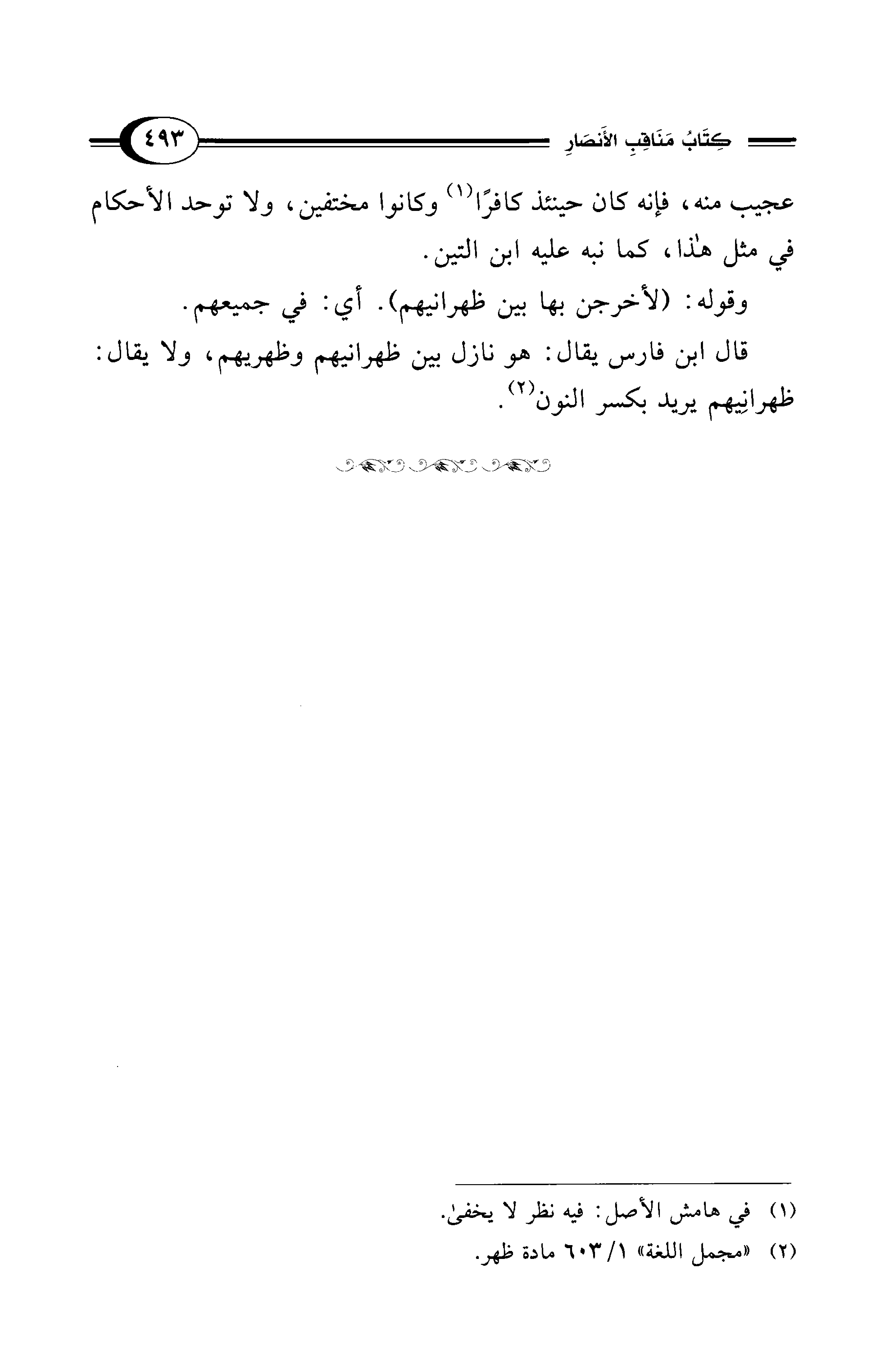 قال ابن فارس يقال: هو نازل بين ظهرانيهم وظهريهم، ولا يقال: ظهرانِيهم يريد بكسر النون (¬2).
