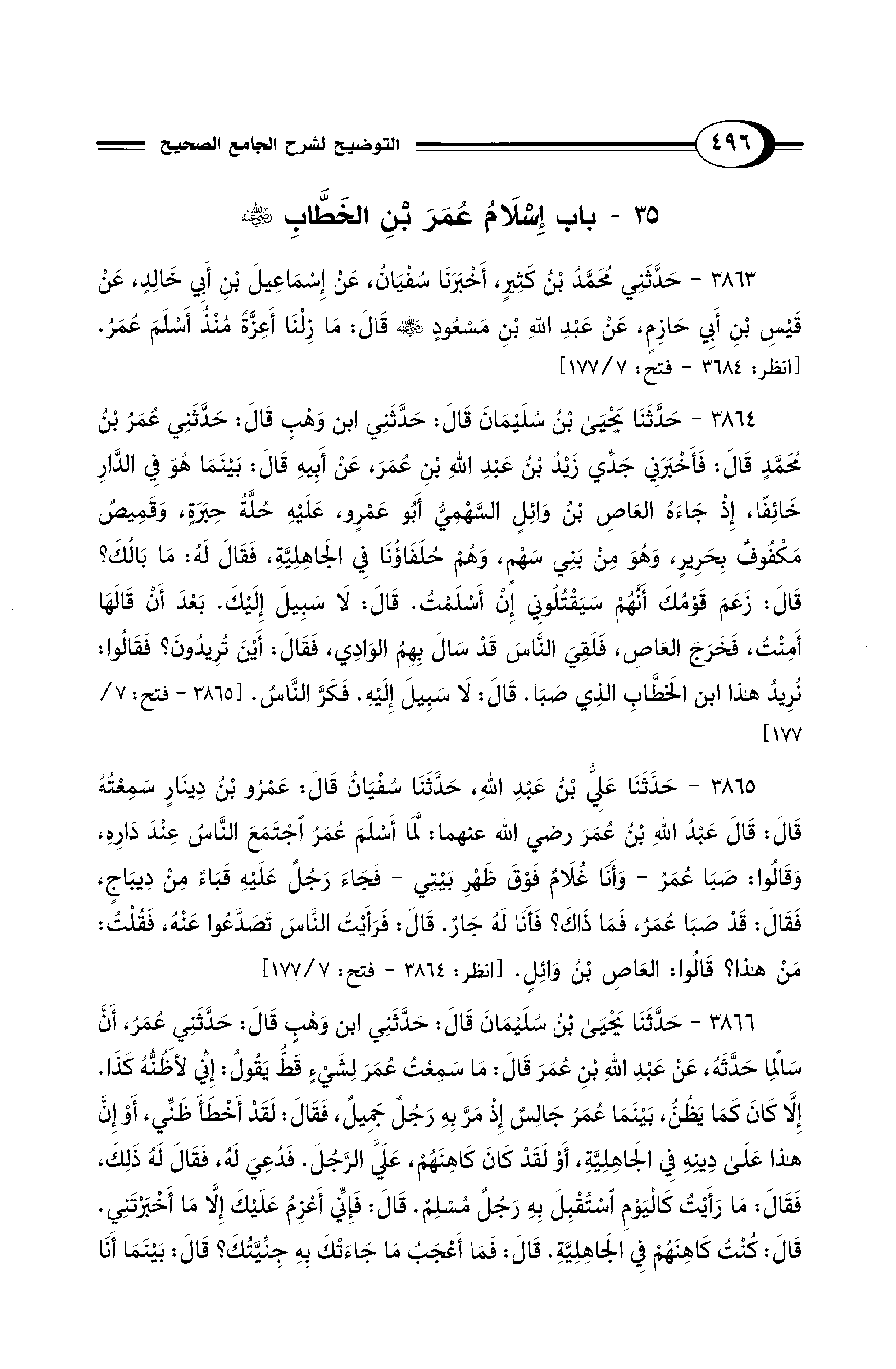 3864 - حَدَّثَنَا يَحْيَى بْنُ سُلَيْمَانَ قَالَ: حَدَّثَنِي ابْنُ وَهْبٍ قَالَ: حَدَّثَنِي عُمَرُ بْنُ مُحَمَّدٍ قَالَ فَأَخْبَرَنِي جَدِّي زَيْدُ بْنُ عَبْدِ اللَّهِ بْنِ عُمَرَ, عَنْ أَبِيهِ قَالَ: بَيْنَمَا هُوَ فِى الدَّارِ خَائِفًا، إِذْ جَاءَهُ الْعَاصِ بْنُ وَائِلٍ السَّهْمِيُّ أَبُو عَمْرٍو، عَلَيْهِ حُلَّةُ حِبَرَةٍ، وَقَمِيصٌ مَكْفُوفٌ بِحَرِيرٍ، وَهُوَ مِنْ بَنِى سَهْمٍ، وَهُمْ حُلَفَاؤُنَا فِى الْجَاهِلِيَّةِ, فَقَالَ لَهُ: مَا بَالُكَ؟ قَالَ زَعَمَ قَوْمُكَ أَنَّهُمْ سَيَقْتُلُونِي إِنْ أَسْلَمْتُ. قَالَ: لاَ سَبِيلَ إِلَيْكَ. بَعْدَ أَنْ قَالَهَا أَمِنْتُ، فَخَرَجَ الْعَاصِ، فَلَقِىَ النَّاسَ قَدْ سَالَ بِهِمُ الْوَادِي, فَقَالَ: أَيْنَ تُرِيدُونَ؟ فَقَالُوا: نُرِيدُ هَذَا ابْنَ الْخَطَّابِ الَّذِى صَبَا. قَالَ: لاَ سَبِيلَ إِلَيْهِ. فَكَرَّ النَّاسُ. [3865 - فتح: 7/ 177]