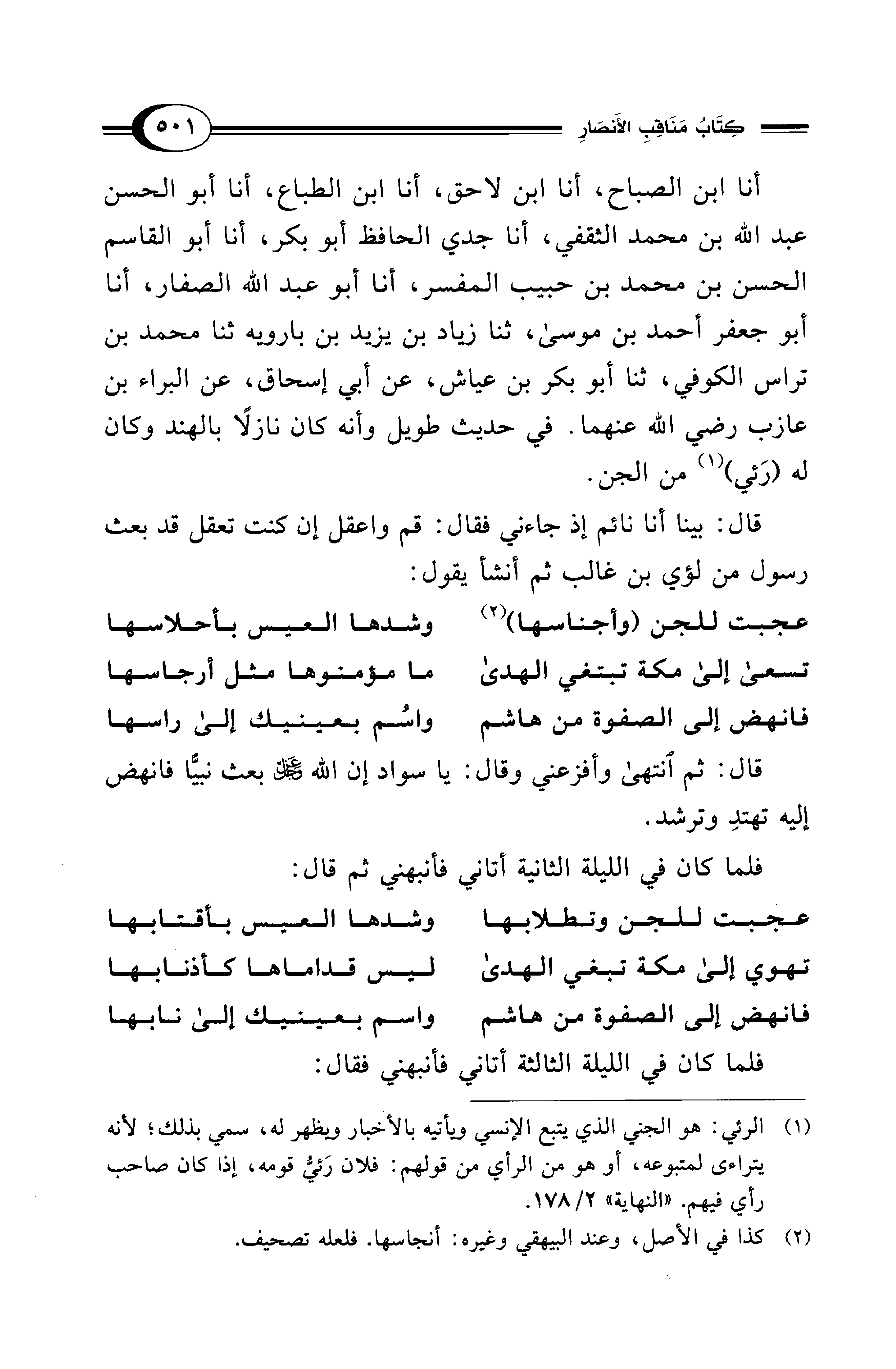أنا ابن الصباح، أنا ابن لاحق، أنا ابن الطباع، أنا أبو الحسن عبد الله بن محمد الثقفي، أنا جدي الحافظ أبو بكر، أنا أبو القاسم الحسن بن محمد بن حبيب المفسر، أنا أبو عبد الله الصفار، أنا أبو جعفر أحمد بن موسى، ثنا زياد بن يزيد بن بارويه ثنا محمد بن تراس الكوفي، ثنا أبو بكر بن عياش، عن أبي إسحاق، عن البراء بن عازب رضي الله عنهما. في حديث طويل وأنه كان نازلًا بالهند وكان له (رئي) (¬1) من الجن.