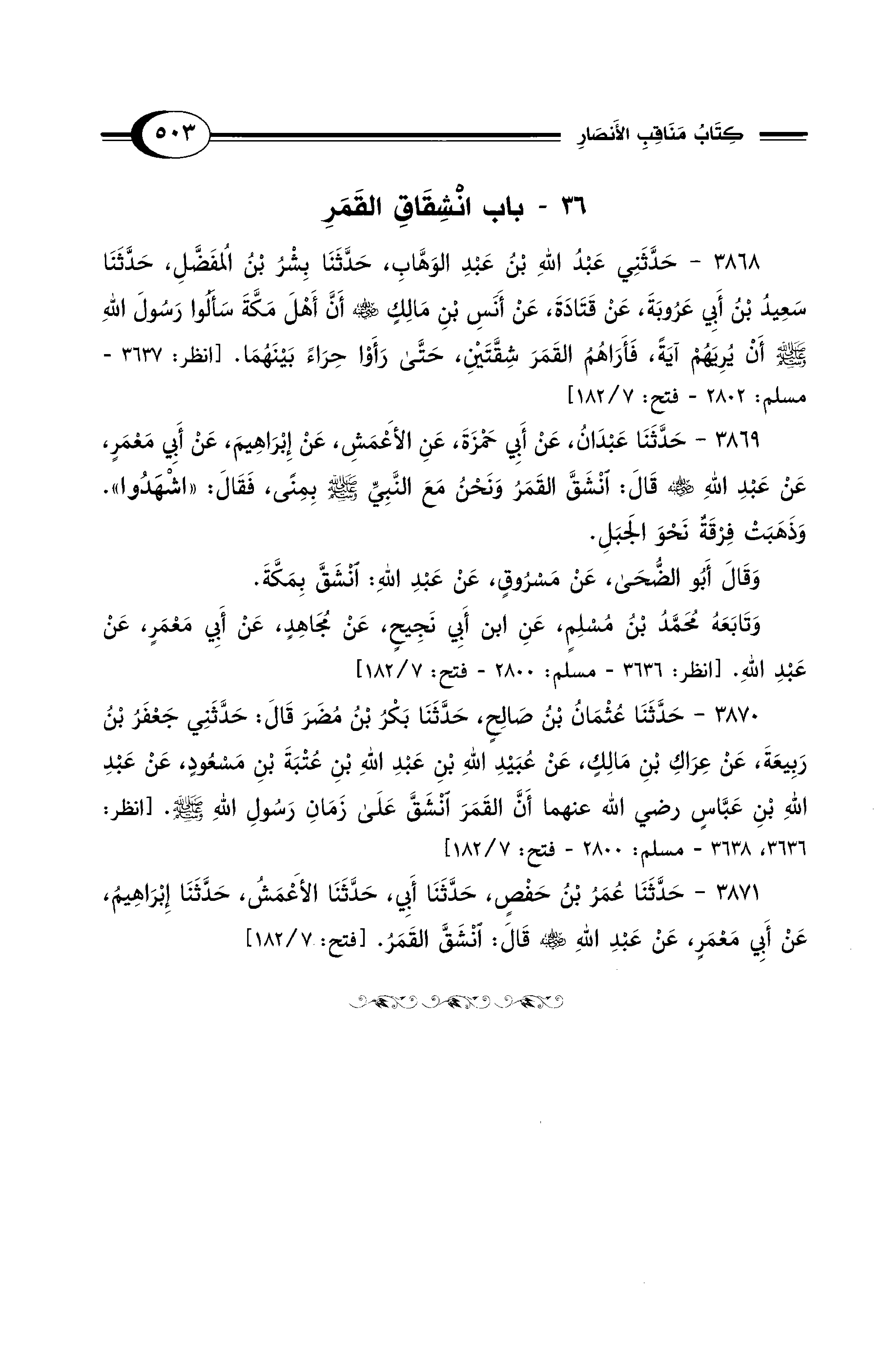 3871 - حَدَّثَنَا عُمَرُ بْنُ حَفْصٍ, حَدَّثَنَا أَبِي, حَدَّثَنَا الأَعْمَشُ, حَدَّثَنَا إِبْرَاهِيمُ, عَنْ أَبِى مَعْمَرٍ, عَنْ عَبْدِ اللَّهِ - رضى الله عنه - قَالَ: انْشَقَّ الْقَمَرُ. [فتح: 7/ 182]