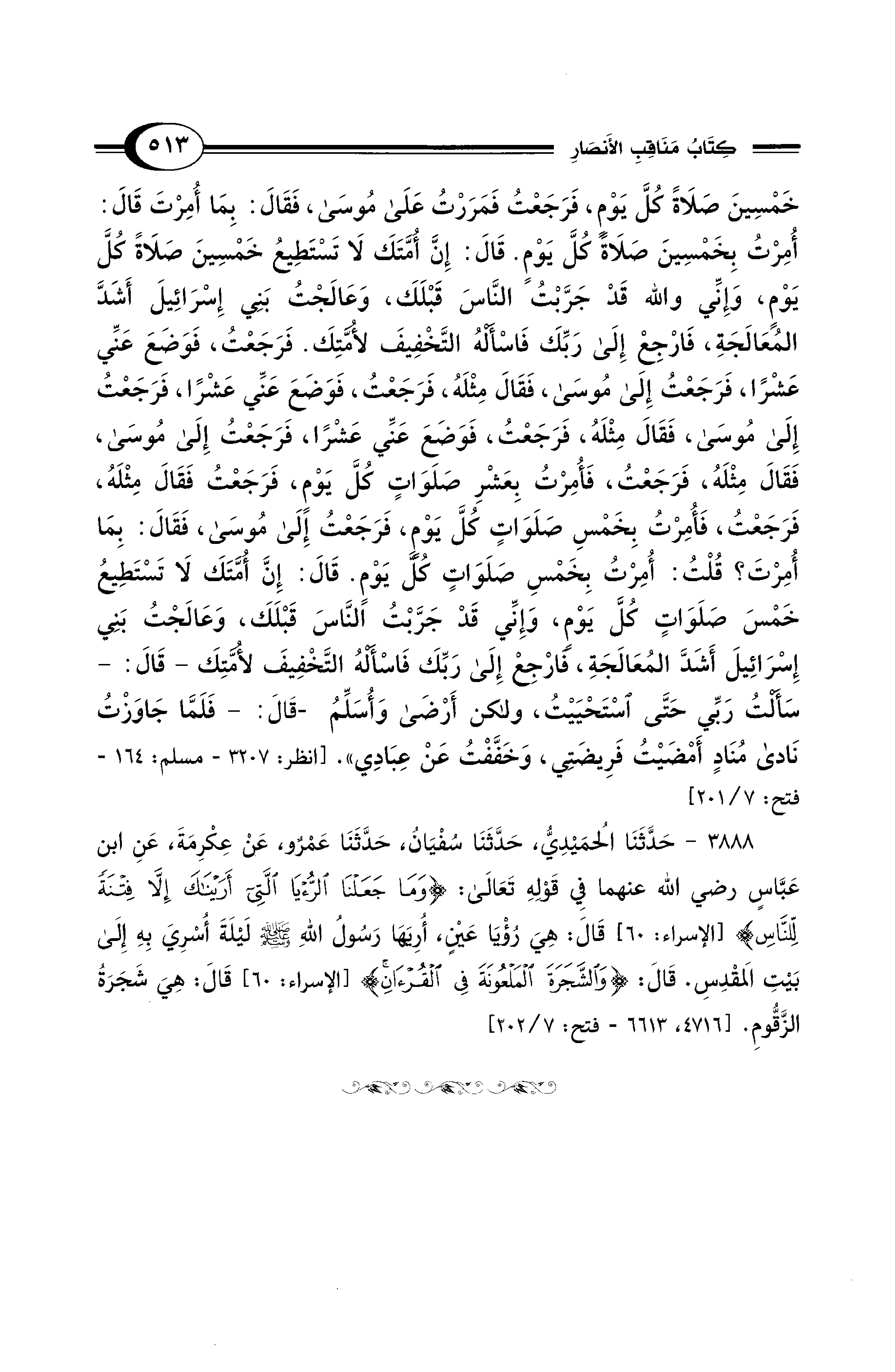 خَمْسِينَ صَلاَةً كُلَّ يَوْمٍ. فَرَجَعْتُ فَمَرَرْتُ عَلَى مُوسَى، فَقَالَ بِمَا أُمِرْتَ قَالَ أُمِرْتُ بِخَمْسِينَ صَلاَةً كُلَّ يَوْمٍ. قَالَ إِنَّ أُمَّتَكَ لاَ تَسْتَطِيعُ خَمْسِينَ صَلاَةً كُلَّ يَوْمٍ، وَإِنِّي وَاللَّهِ قَدْ جَرَّبْتُ النَّاسَ قَبْلَكَ، وَعَالَجْتُ بَنِى إِسْرَائِيلَ أَشَدَّ الْمُعَالَجَةِ، فَارْجِعْ إِلَى رَبِّكَ فَاسْأَلْهُ التَّخْفِيفَ لأُمَّتِكَ. فَرَجَعْتُ، فَوَضَعَ عَنِّي عَشْرًا، فَرَجَعْتُ إِلَى مُوسَى فَقَالَ مِثْلَهُ، فَرَجَعْتُ فَوَضَعَ عَنِّي عَشْرًا، فَرَجَعْتُ إِلَى مُوسَى فَقَالَ مِثْلَهُ، فَرَجَعْتُ فَوَضَعَ عَنِّي عَشْرًا، فَرَجَعْتُ إِلَى مُوسَى فَقَالَ مِثْلَهُ، فَرَجَعْتُ فَأُمِرْتُ بِعَشْرِ صَلَوَاتٍ كُلَّ يَوْمٍ، فَرَجَعْتُ فَقَالَ مِثْلَهُ، فَرَجَعْتُ فَأُمِرْتُ بِخَمْسِ صَلَوَاتٍ كُلَّ يَوْمٍ، فَرَجَعْتُ إِلَى مُوسَى، فَقَالَ بِمَا أُمِرْتَ قُلْتُ أُمِرْتُ بِخَمْسِ صَلَوَاتٍ كُلَّ يَوْمٍ. قَالَ إِنَّ أُمَّتَكَ لاَ تَسْتَطِيعُ خَمْسَ صَلَوَاتٍ كُلَّ يَوْمٍ، وَإِنِّي قَدْ جَرَّبْتُ النَّاسَ قَبْلَكَ، وَعَالَجْتُ بَنِي إِسْرَائِيلَ أَشَدَّ الْمُعَالَجَةِ، فَارْجِعْ إِلَى رَبِّكَ فَاسْأَلْهُ التَّخْفِيفَ لأُمَّتِكَ. قَالَ سَأَلْتُ رَبِّي حَتَّى اسْتَحْيَيْتُ، وَلَكِنْ أَرْضَى وَأُسَلِّمُ - قَالَ: - فَلَمَّا جَاوَزْتُ نَادَى مُنَادٍ أَمْضَيْتُ فَرِيضَتِي, وَخَفَّفْتُ عَنْ عِبَادِي». [انظر: 3207 - مسلم: 164 - فتح: 7/ 201]