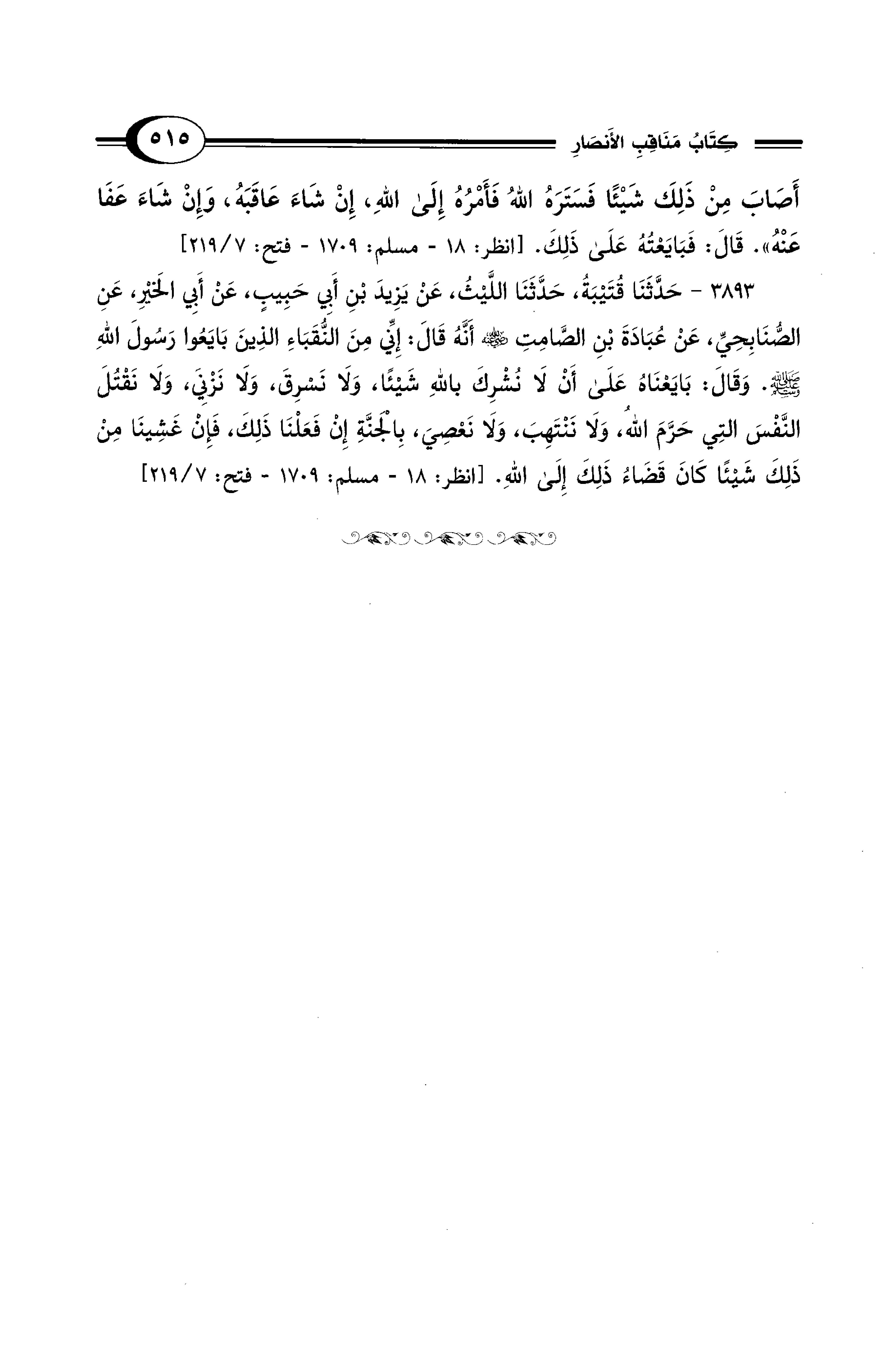 3893 - حَدَّثَنَا قُتَيْبَةُ حَدَّثَنَا اللَّيْثُ, عَنْ يَزِيدَ بْنِ أَبِى حَبِيبٍ, عَنْ أَبِي الْخَيْرِ, عَنِ الصُّنَابِحِيِّ, عَنْ عُبَادَةَ بْنِ الصَّامِتِ - رضى الله عنه - أَنَّهُ قَالَ: إِنِّي مِنَ النُّقَبَاءِ الَّذِينَ بَايَعُوا رَسُولَ اللَّهِ - صلى الله عليه وسلم -. وَقَالَ:, بَايَعْنَاهُ عَلَى أَنْ لاَ نُشْرِكَ بِاللَّهِ شَيْئًا، وَلاَ نَسْرِقَ، وَلاَ نَزْنِيَ، وَلاَ نَقْتُلَ النَّفْسَ الَّتِي حَرَّمَ اللَّهُ، وَلاَ نَنْتَهِبَ، وَلاَ نَعْصِيَ بِالْجَنَّةِ إِنْ فَعَلْنَا ذَلِكَ، فَإِنْ غَشِينَا مِنْ ذَلِكَ شَيْئًا كَانَ قَضَاءُ ذَلِكَ إِلَى اللَّهِ. [انظر: 18 - مسلم: 1709 - فتح: 7/ 219]