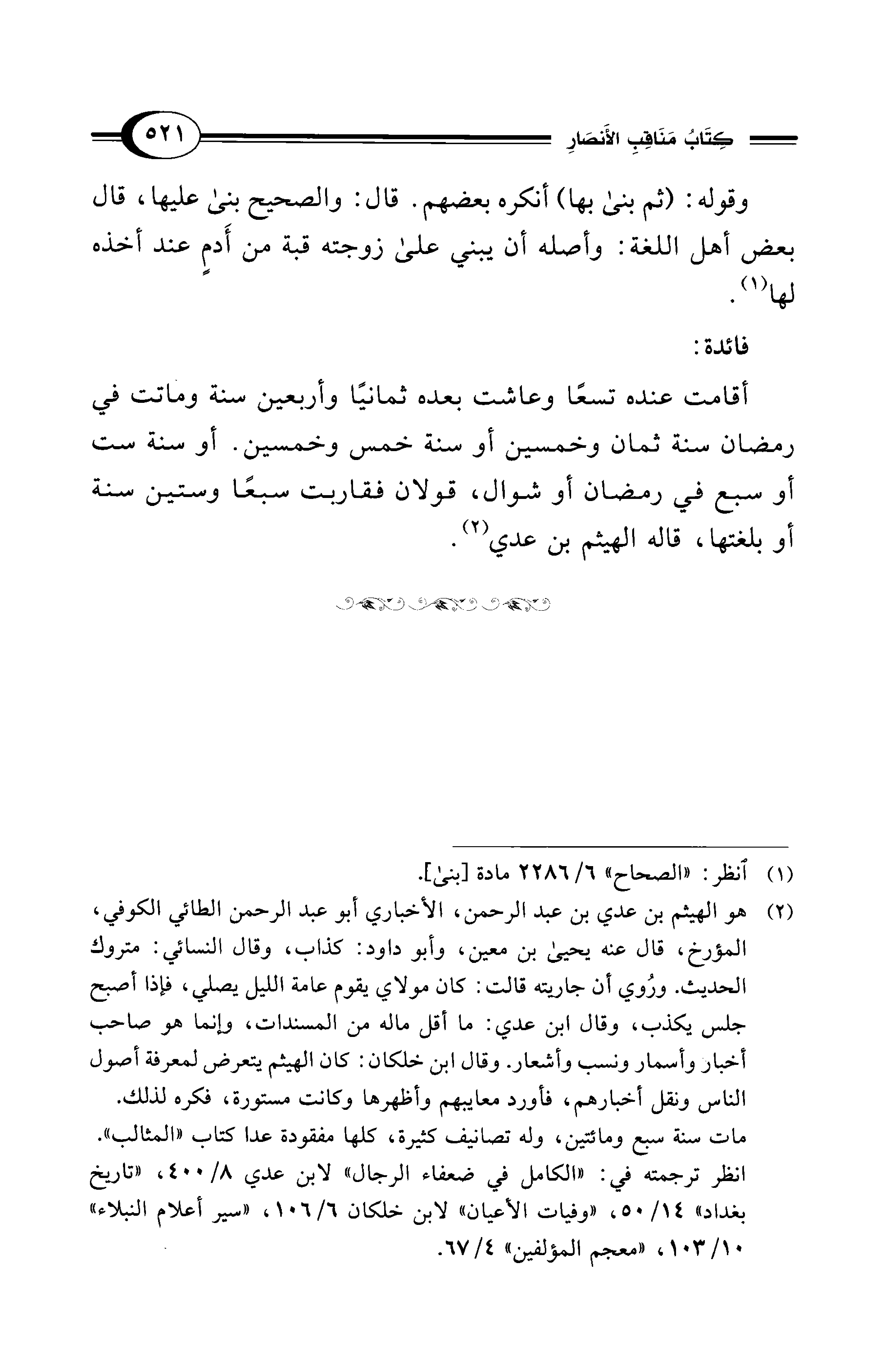 (¬2) هو الهيثم بن عدي بن عبد الرحمن، الأخباري أبو عبد الرحمن الطائي الكوفي، المؤرخ، قال عنه يحيى بن معين، وأبو داود: كذاب، وقال النسائي: متروك الحديث. ورُوي أن جاريته قالت: كان مولاي يقوم عامة الليل يصلي، فماذا أصبح جلس يكذب، وقال ابن عدي: ما أقل ماله من المسندات، وإنما هو صاحب أخبار وأسمار ونسب وأشعار. وقال ابن خلكان: كان الهيثم يتعرض لمعرفة أصول الناس ونقل أخبارهم، فأورد معايبهم وأظهرها وكانت مستورة، فكره لذلك. مات سنة سبع ومائتين، وله تصانيف كثيرة، كلها مفقودة عدا كتاب "المثالب". انظر ترجمته في: "الكامل في ضعفاء الرجال" لابن عدي 8/ 400، "تاريخ بغداد" 14/ 50، "وفيات الأعيان" لابن خلكان 6/ 106، "سير أعلام النبلاء" 10/ 103، "معجم المؤلفين" 4/ 67.