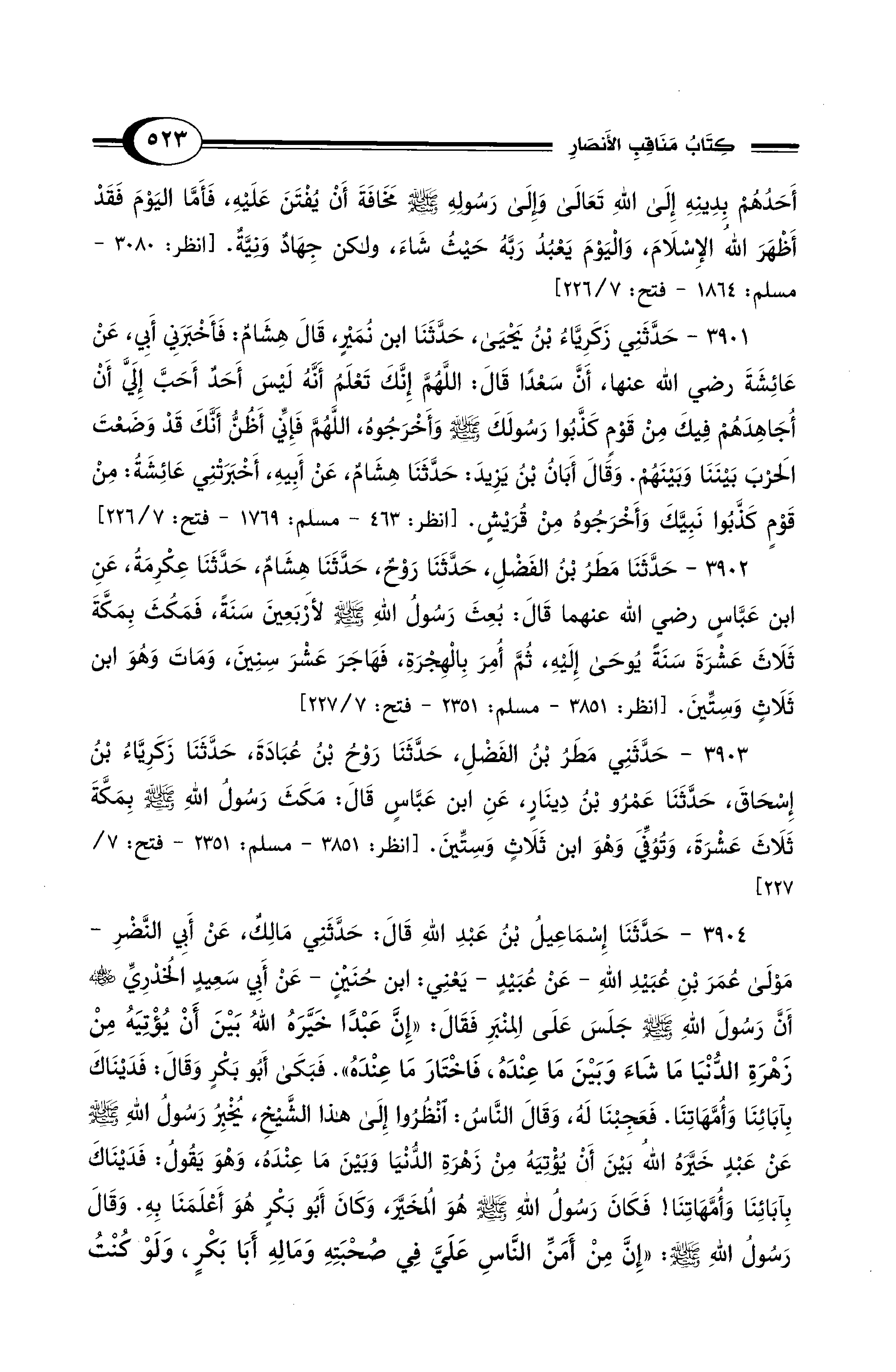 3901 - حَدَّثَنِي زَكَرِيَّاءُ بْنُ يَحْيَى, حَدَّثَنَا ابْنُ نُمَيْرٍ, قَالَ هِشَامٌ: فَأَخْبَرَنِي أَبِي, عَنْ عَائِشَةَ - رضي الله عنها -, أَنَّ سَعْدًا قَالَ: اللَّهُمَّ إِنَّكَ تَعْلَمُ أَنَّهُ لَيْسَ أَحَدٌ أَحَبَّ إِلَىَّ أَنْ أُجَاهِدَهُمْ فِيكَ مِنْ قَوْمٍ كَذَّبُوا رَسُولَكَ - صلى الله عليه وسلم - وَأَخْرَجُوهُ، اللَّهُمَّ فَإِنِّي أَظُنُّ أَنَّكَ قَدْ وَضَعْتَ الْحَرْبَ بَيْنَنَا وَبَيْنَهُمْ. وَقَالَ أَبَانُ بْنُ يَزِيدَ: حَدَّثَنَا هِشَامٌ, عَنْ أَبِيهِ, أَخْبَرَتْنِي عَائِشَةُ: مِنْ قَوْمٍ كَذَّبُوا نَبِيَّكَ وَأَخْرَجُوهُ مِنْ قُرَيْشٍ. [انظر: 463 - مسلم: 1769, فتح: 7/ 226]