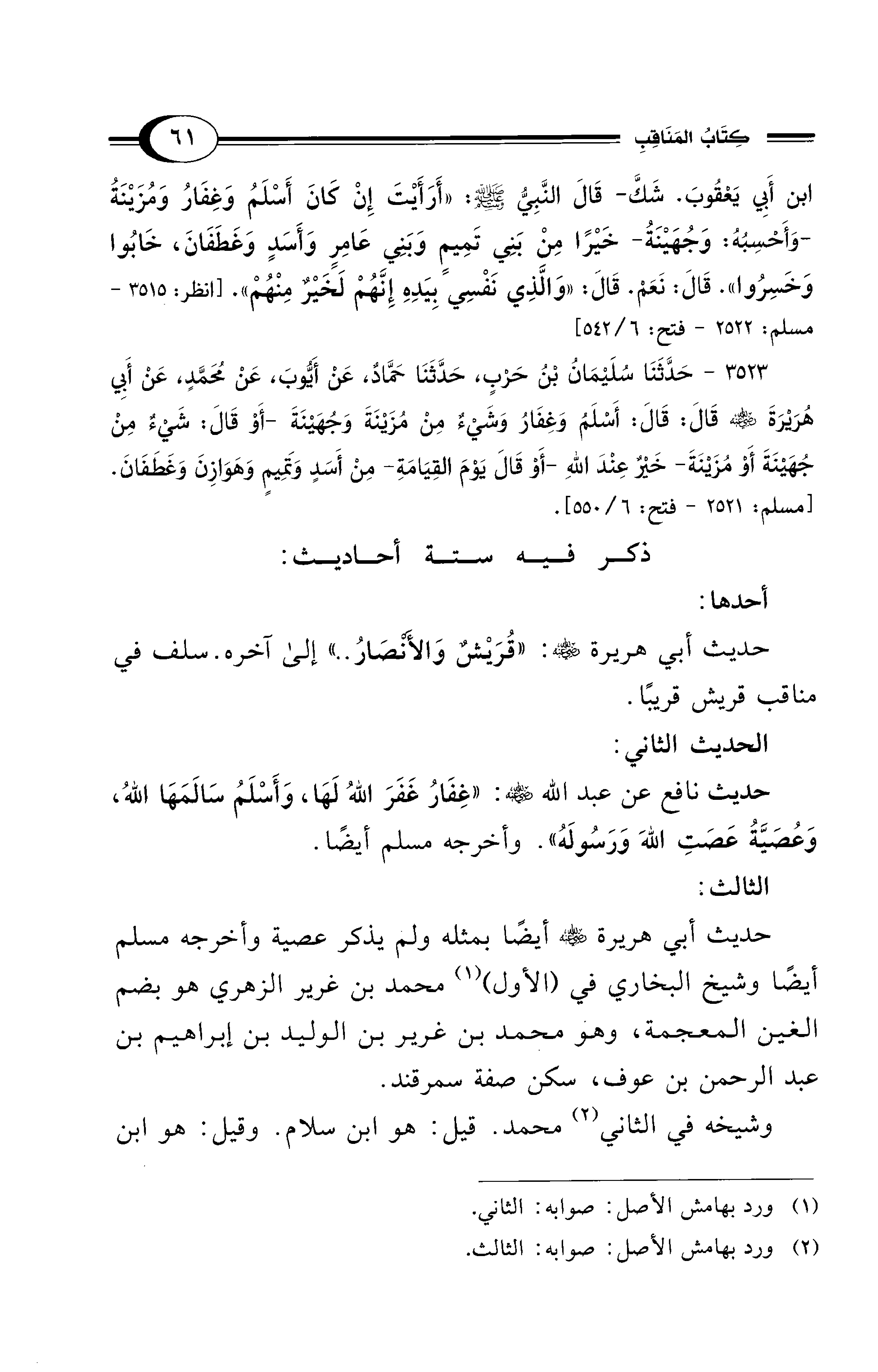 3523 - حَدَّثَنَا سُلَيْمَانُ بْنُ حَرْبٍ, حَدَّثَنَا حَمَّادٌ, عَنْ أَيُّوبَ, عَنْ مُحَمَّدٍ, عَنْ أَبِي هُرَيْرَةَ - رضي الله عنه - قَالَ: قَالَ أَسْلَمُ وَغِفَارُ وَشَيْءٌ مِنْ مُزَيْنَةَ وَجُهَيْنَةَ -أَوْ قَالَ: شَيْءٌ مِنْ جُهَيْنَةَ أَوْ مُزَيْنَةَ- خَيْرٌ عِنْدَ اللهِ -أَوْ قَالَ يَوْمَ القِيَامَةِ- مِنْ أَسَدٍ وَتَمِيمٍ وَهَوَازِنَ وَغَطَفَانَ. [مسلم: 2521 - فتح: 6/ 550]