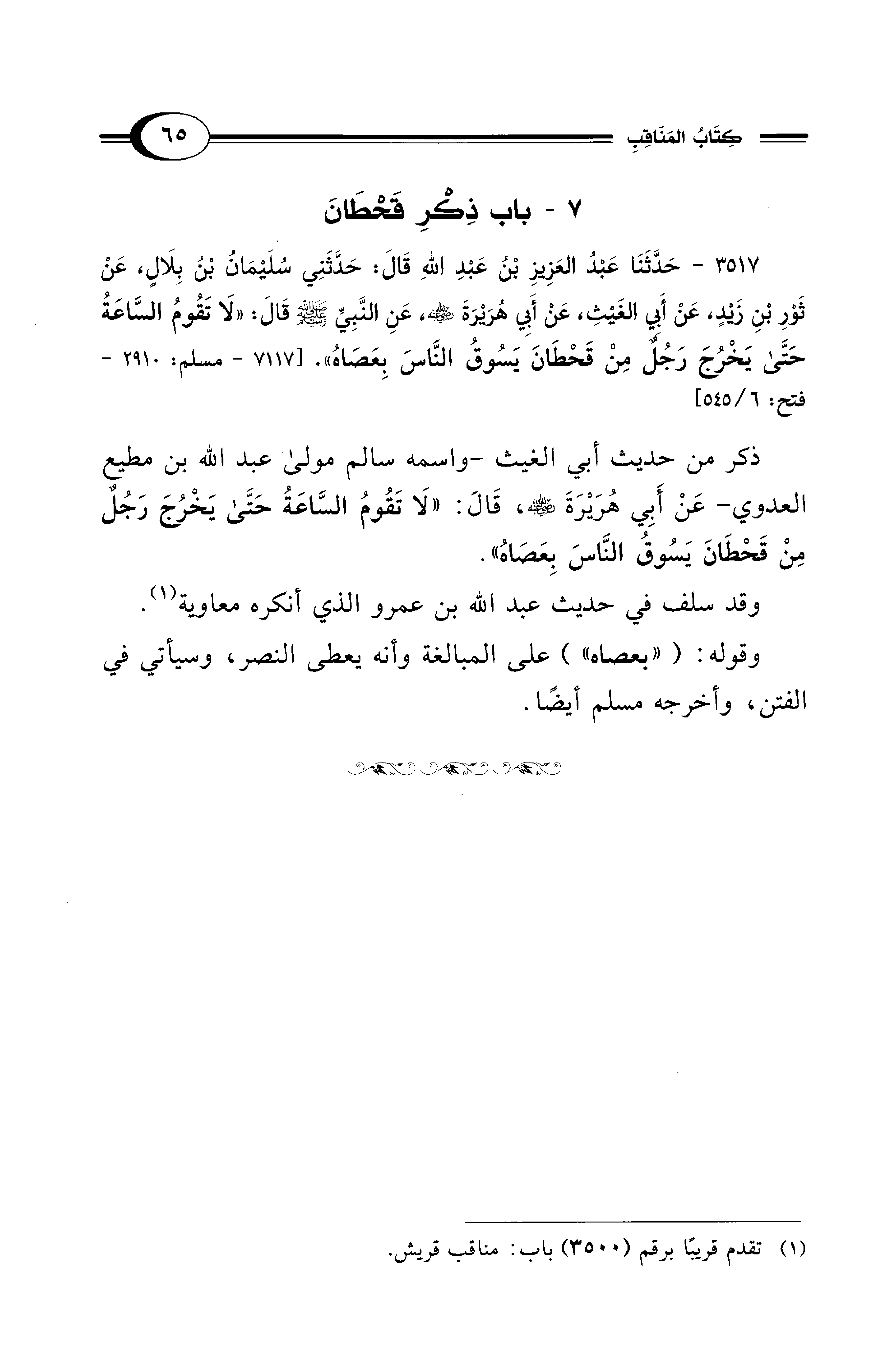3517 - حَدَّثَنَا عَبْدُ العَزِيزِ بْنُ عَبْدِ اللهِ قَالَ: حَدَّثَنِي سُلَيْمَانُ بْنُ بِلاَلٍ, عَنْ ثَوْرِ بْنِ زَيْدٍ, عَنْ أَبِي الغَيْثِ, عَنْ أَبِي هُرَيْرَةَ - رضي الله عنه -, عَنِ النَّبِيِّ - صلى الله عليه وسلم - قَالَ: «لاَ تَقُومُ السَّاعَةُ حَتَّى يَخْرُجَ رَجُلٌ مِنْ قَحْطَانَ يَسُوقُ النَّاسَ بِعَصَاهُ». [7117 - مسلم: 2910 - فتح: 6/ 545]