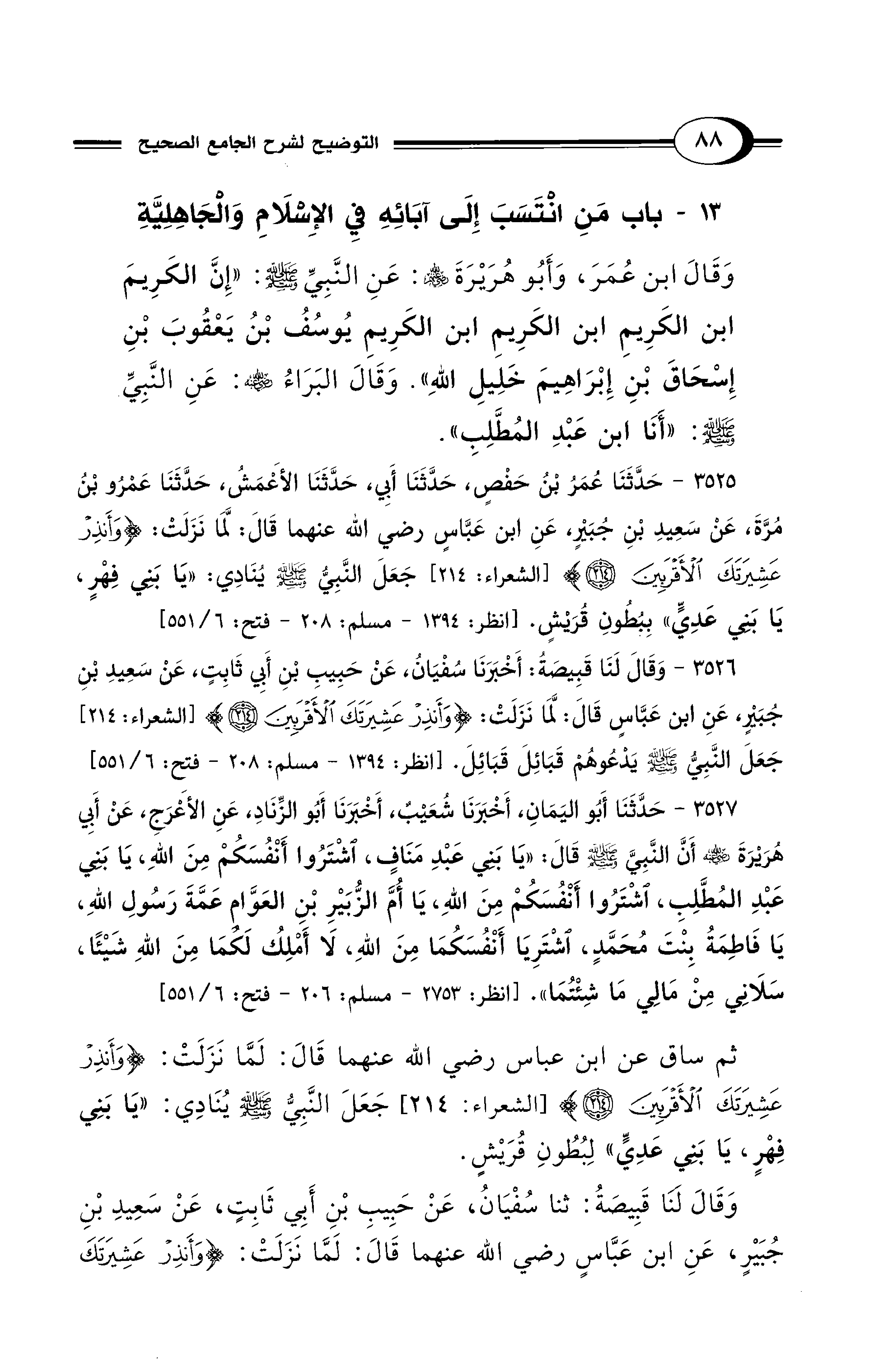 3526 - وَقَالَ لَنَا قَبِيصَةُ: أَخْبَرَنَا سُفْيَانُ, عَنْ حَبِيبِ بْنِ أَبِي ثَابِتٍ, عَنْ سَعِيدِ بْنِ جُبَيْرٍ, عَنِ ابْنِ عَبَّاسٍ قَالَ: لَمَّا نَزَلَتْ: {وَأَنْذِرْ عَشِيرَتَكَ الْأَقْرَبِينَ (214)} [الشعراء: 214] جَعَلَ النَّبِيُّ - صلى الله عليه وسلم - يَدْعُوهُمْ قَبَائِلَ قَبَائِلَ. [انظر: 1394 - مسلم: 208 - فتح: 6/ 551]