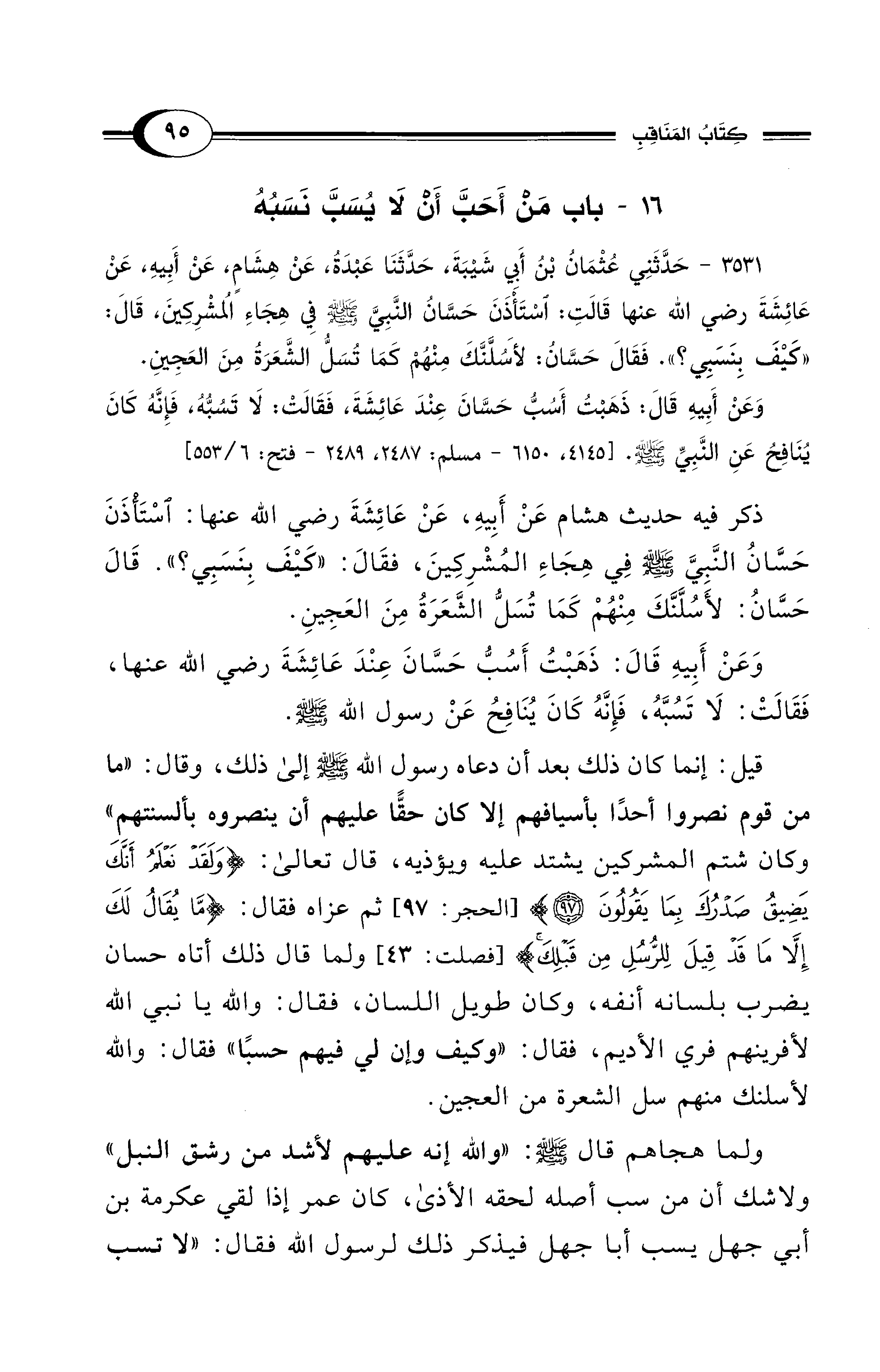 3531 - حَدَّثَنِى عُثْمَانُ بْنُ أَبِي شَيْبَةَ, حَدَّثَنَا عَبْدَةُ, عَنْ هِشَامٍ, عَنْ أَبِيهِ, عَنْ عَائِشَةَ - رضي الله عنها - قَالَتِ: اسْتَأْذَنَ حَسَّانُ النَّبِيَّ - صلى الله عليه وسلم - فِي هِجَاءِ الْمُشْرِكِينَ، قَالَ: «كَيْفَ بِنَسَبِي؟». فَقَالَ حَسَّانُ: لأَسُلَّنَّكَ مِنْهُمْ كَمَا تُسَلُّ الشَّعَرَةُ مِنَ الْعَجِينِ.