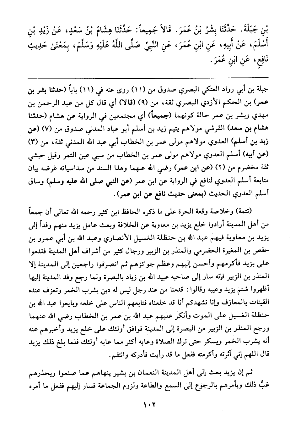 بْنِ جَبَلَةَ. حَدَّثَنَا بِشْرُ بْنُ عُمَرَ. قَالا جَمِيعًا: حَدَّثَنَا هِشَامُ بْنُ سَعْدٍ، عَنْ زَيدِ بْنِ أَسْلَمَ، عَنْ أَبِيهِ، عَنِ ابْنِ عُمَرَ، عَنِ النَّبِيِّ صَلَّى اللهُ عَلَيهِ وَسَلَّمَ، بِمَعْنَى حَدِيثِ نَافِعٍ، عَنِ ابْنِ عُمَرَ
