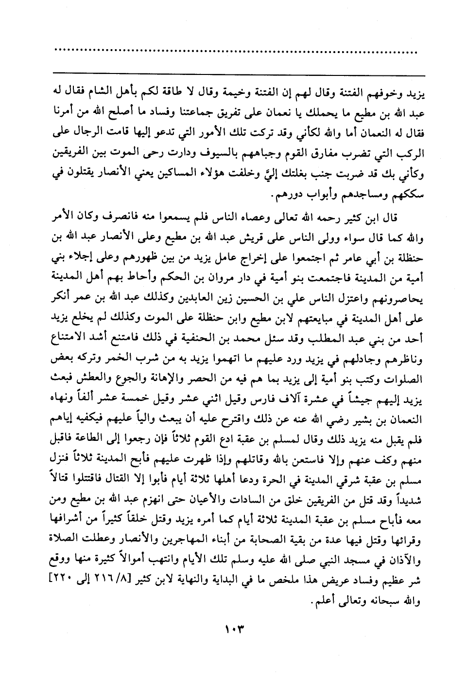 قال ابن كثير رحمه الله تعالى وعصاه الناس فلم يسمعوا منه فانصرف وكان الأمر والله كما قال سواء وولى الناس على قرييش عبد الله بن مطيع وعلى الأنصار عبد الله بن حنظلة بن أبي عامر ثم اجتمعوا على إخراج عامل يزيد من بين ظهورهم وعلى إجلاء بني أمية من المدينة فاجتمعت بنو أمية في دار مروان بن الحكم وأحاط بهم أهل المدينة يحاصرونهم واعتزل الناس علي بن الحسين زين العابدين وكذلك عبد الله بن عمر أنكر على أهل المدينة في مبايعتهم لابن مطيع وابن حنظلة على الموت وكذلك لم يخلع يزيد أحد من بني عبد المطلب وقد سئل محمد بن الحنفية في ذلك فامتنع أشد الامتناع وناظرهم وجادلهم في يزيد ورد عليهم ما اتهموا يزيد به من شرب الخمر وتركه بعض الصلوات وكتب بنو أمية إلى يزيد بما هم فيه من الحصر والإهانة والجوع والعطش فبعث يزيد إليهم جيشًا في عشرة آلاف فارس وقيل اثني عشر وقيل خمسة عشر ألفًا ونهاه النعمان بن بشير رضي الله عنه عن ذلك واقترح عليه أن يبعث واليًا عليهم فيكفيه إياهم فلم يقبل منه يزيد ذلك وقال لمسلم بن عقبة ادع القوم ثلاثًا فإن رجعوا إلى الطاعة فاقبل منهم وكف عنهم وإلا فاستعن بالله وقاتلهم وإذا ظهرت عليهم فأبح المدينة ثلاثًا فنزل مسلم بن عقبة شرقي المدينة في الحرة ودعا أهلها ثلاثة أيام فأبوا إلا القتال فاقتتلوا قتالًا شديدًا وقد قتل من الفريقين خلق من السادات والأعيان حتى انهزم عبد الله بن مطيع ومن معه فأباح مسلم بن عقبة المدينة ثلاثة أيام كما أمره يزيد وقتل خلقًا كثيرًا من أشرافها وقرائها وقتل فيها عدة من بقية الصحابة من أبناء المهاجرين والأنصار وعطلت الصلاة والآذان في مسجد النبي صلى الله عليه وسلم تلك الأيام وانتهب أموالًا كثيرة منها ووقع شر عظيم وفساد عريض هذا ملخص ما في البداية والنهاية لابن كثير [٨/ ٢١٦ إلى ٢٢٠] والله سبحانه وتعالى أعلم.