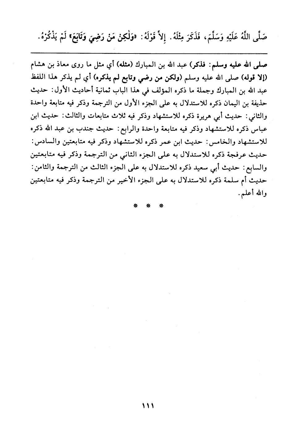 صلى الله عليه وسلم: فذكر) عبد الله بن المبارك (مثله) أي مثل ما روى معاذ بن هشام (إلا قوله) صلى الله عليه وسلم (ولكن من رضي وتابع لم يذكره) أي لم يذكر هذا اللفظ عبد الله بن المبارك وجملة ما ذكره المؤلف في هذا الباب ثمانية أحاديث الأول: حديث حذيفة بن اليمان ذكره للاستدلال به على الجزء الأول من الترجمة وذكر فيه متابعة واحدة والثاني: حديث أبي هريرة ذكره للاستشهاد وذكر فيه ثلاث متابعات والثالث: حديث ابن عباس ذكره للاستشهاد وذكر فيه متابعة واحدة والرابع: حديث جندب بن عبد الله ذكره للاستشهاد والخامس: حديث ابن عمر ذكره للاستشهاد وذكر فيه متابعتين والسادس: حديث عرفجة ذكره للاستدلال به على الجزء الثاني من الترجمة وذكر فيه متابعتين والسابع: حديث أبي سعيد ذكره للاستدلال به على الجزء الثالث من الترجمة والثامن: حديث أم سلمة ذكره للاستدلال به على الجزء الأخير من الترجمة وذكر فيه متابعتين والله أعلم.