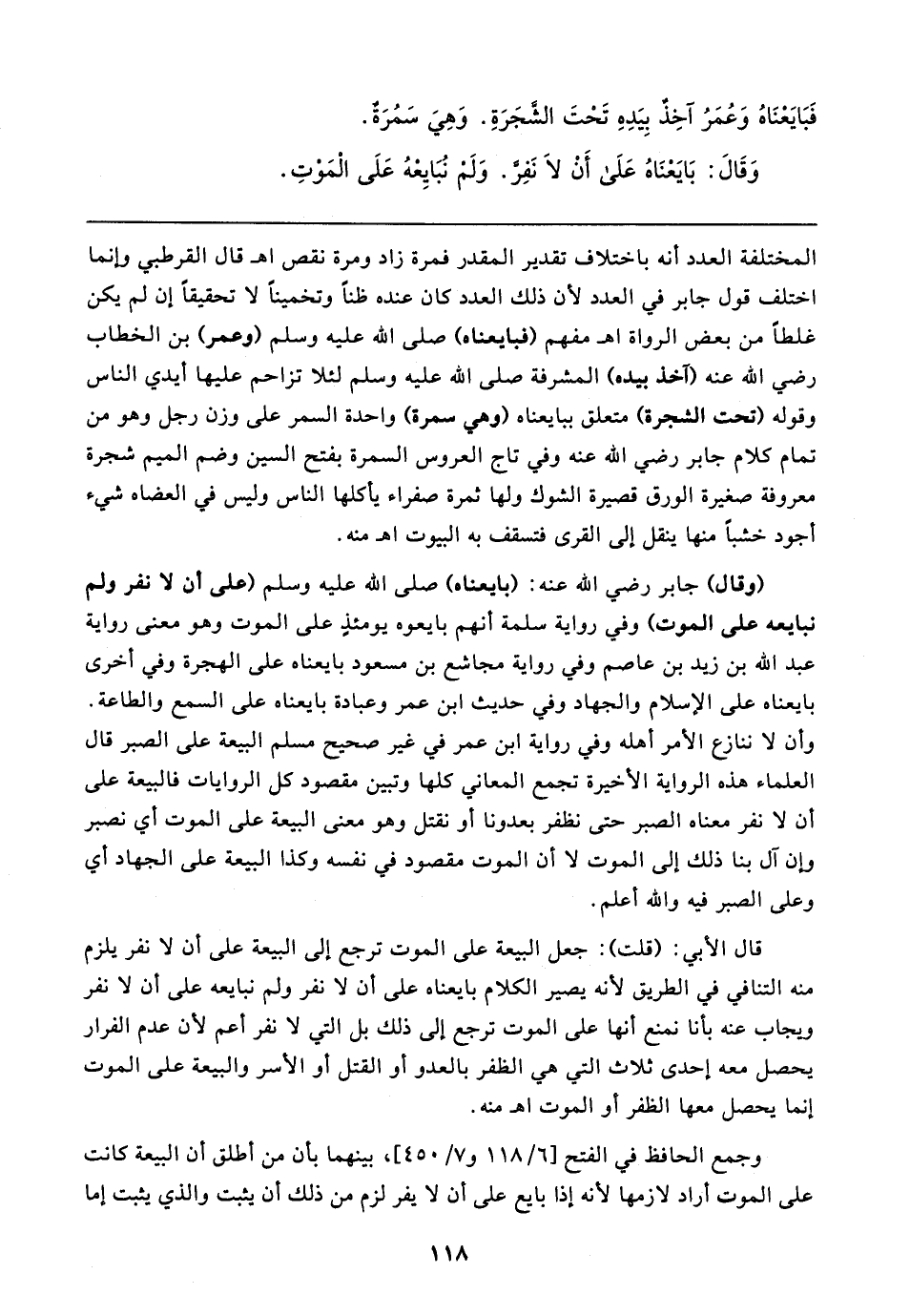 قال الأبي: (قلت): جعل البيعة على الموت ترجع إلى البيعة على أن لا نفر يلزم منه التنافي في الطريق لأنه يصير الكلام بايعناه على أن لا نفر ولم نبايعه على أن لا نفر ويجاب عنه بأنا نمنع أنها على الموت ترجع إلى ذلك بل التي لا نفر أعم لأن عدم الفرار يحصل معه إحدى ثلاث التي هي الظفر بالعدو أو القتل أو الأسر والبيعة على الموت إنما يحصل معها الظفر أو الموت اهـ منه.