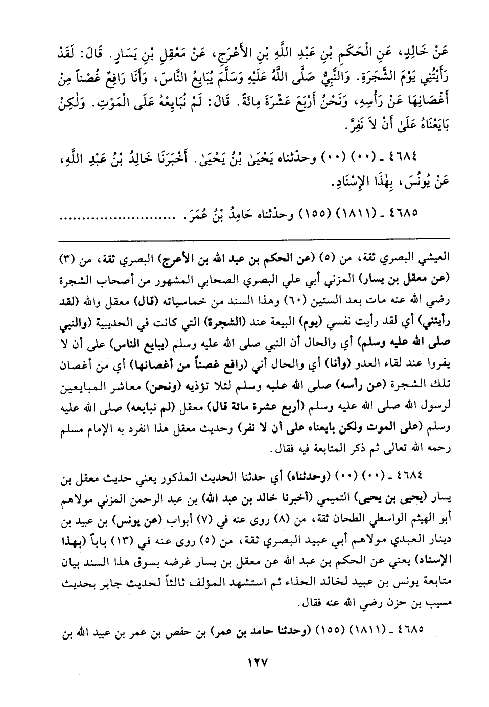 عَنْ خَالِدٍ، عَنِ الْحَكَمِ بْنِ عَبْدِ اللهِ بْنِ الأَعْرَجِ، عَنْ مَعْقِلِ بْنِ يَسَارٍ. قَال: لَقَدْ رَأَيتُنِي يَوْمَ الشَّجَرَةِ. وَالنَّبِيُّ صَلَّى اللهُ عَلَيهِ وَسَلَّمَ يُبَايِعُ النَّاسَ، وَأنَا رَافِعٌ غُصْنًا مِن أَغْصَانِهَا عَنْ رَأْسِهِ، وَنَحْنُ أَرْبَعَ عَشْرَةَ مِائَةً. قَال: لَمْ نُبَايِعْهُ عَلَى الْمَوْتِ. وَلكِنْ بَايَعْنَاهُ عَلَى أَنْ لَا نَفِرَّ.