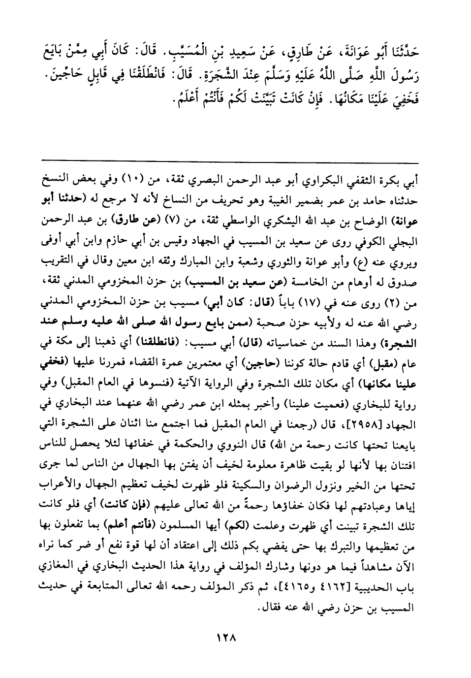 حَدَّثَنَا أَبُو عَوَانَةَ، عَنْ طَارِقٍ، عَنْ سَعِيدِ بْنِ الْمُسَيَّبِ. قَال: كَانَ أَبِي مِمَّنْ بَايَعَ رَسُولَ اللهِ صَلَّى اللهُ عَلَيهِ وَسَلَّمَ عِنْدَ الشَّجَرَةِ. قَال: فَانْطَلَقنَا فِي قَابِلٍ حَاجِّينَ. فَخَفِيَ عَلَينَا مَكَانُهَا. فَإِنْ كَانَتْ تَبَيَّنَتْ لَكُمْ فَأَنْتُمْ أَعْلَمُ