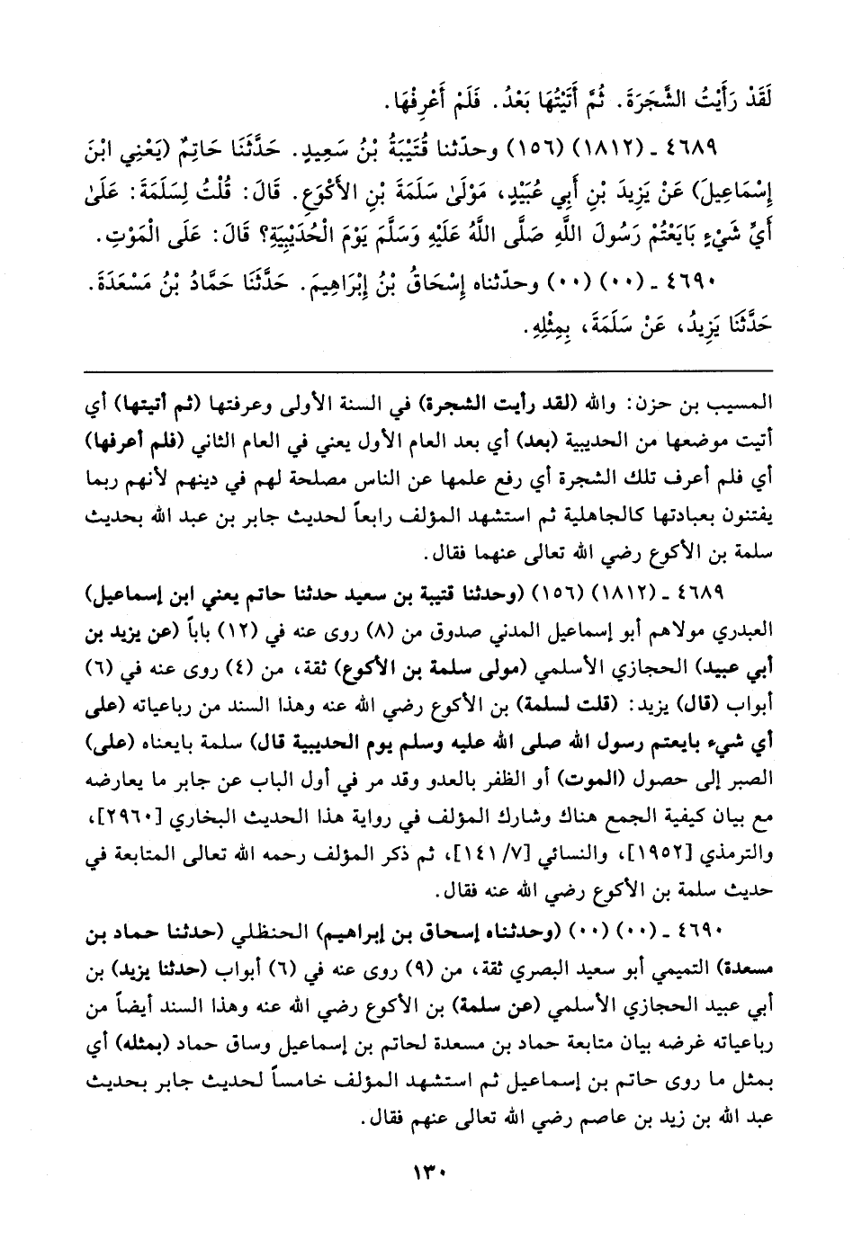 ٤٦٨٩ - (١٨١٢) (١٥٦) (وحدثنا قتيبة بن سعيد حدثنا حاتم يعني ابن إسماعيل) العبدري مولاهم أبو إسماعيل المدني صدوق من (٨) روى عنه في (١٢) بابا (عن يزيد بن أبي عبيد) الحجازي الأسلمي (مولى سلمة بن الأكوع) ثقة، من (٤) روى عنه في (٦) أبواب (قال) يزيد: (قلت لسلمة) بن الأكوع رضي الله عنه وهذا السند من رباعياته (على أي شيء بايعتم رسول الله صلى الله عليه وسلم يوم الحديبية قال) سلمة بايعناه (على) الصبر إلى حصول (الموت) أو الظفر بالعدو وقد مر في أول الباب عن جابر ما يعارضه مع بيان كيفية الجمع هناك وشارك المؤلف في رواية هذا الحديث البخاري [٢٩٦٠]، والترمذي [١٩٥٢]، والنسائي [٧/ ١٤١]، ثم ذكر المؤلف رحمه الله تعالى المتابعة في حديث سلمة بن الأكوع رضي الله عنه فقال.