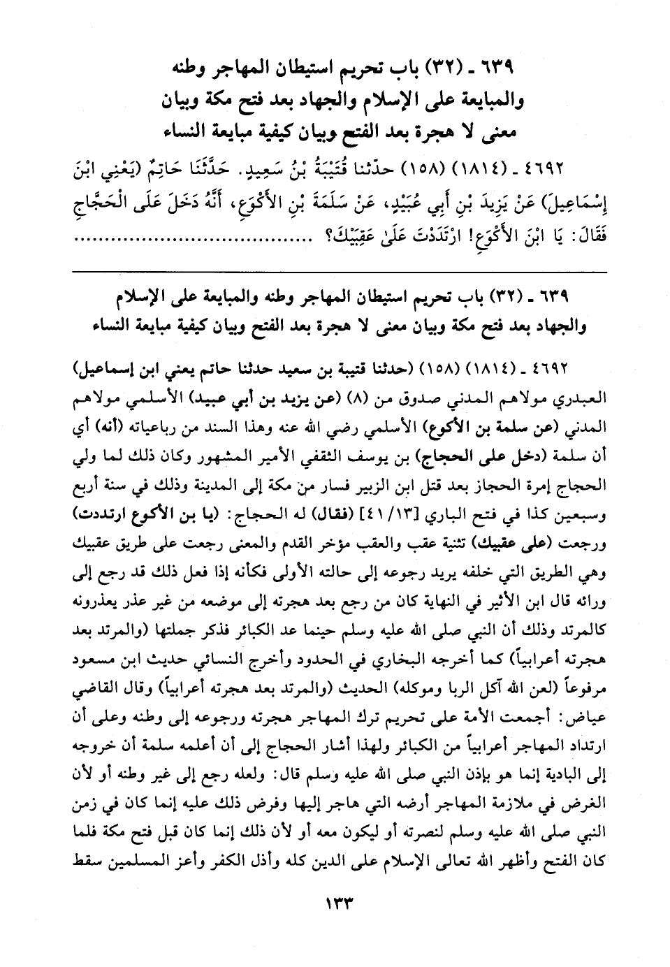 ٦٣٩ - (٣٢) باب تحريم استيطان المهاجر وطنه والمبايعة على الإسلام والجهاد بعد فتح مكة وبيان معنى لا هجرة بعد الفتح وبيان كيفية مبايعة النساء