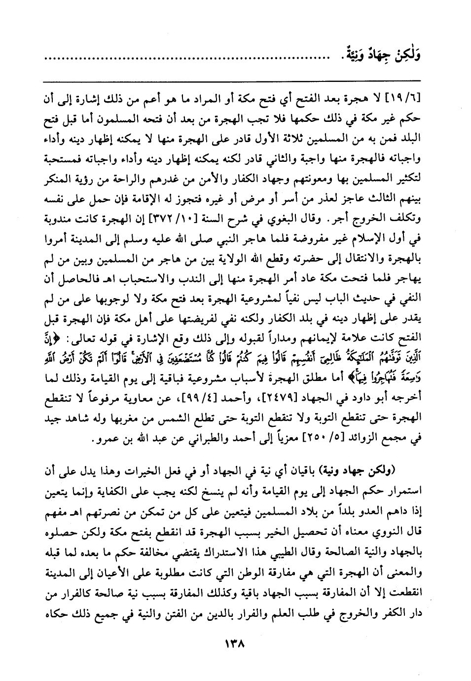 [٦/ ١٩] لا هجرة بعد الفتح أي فتح مكة أو المراد ما هو أعم من ذلك إشارة إلى أن حكم غير مكة في ذلك حكمها فلا تجب الهجرة من بعد أن فتحه المسلمون أما قبل فتح البلد فمن به من المسلمين ثلاثة الأول قادر على الهجرة منها لا يمكنه إظهار دينه وأداء واجباته فالهجرة منها واجبة والثاني قادر لكنه يمكنه إظهار دينه وأداء واجباته فمستحبة لتكثير المسلمين بها ومعونتهم وجهاد الكفار والأمن من غدرهم والراحة من رؤية المنكر بينهم الثالث عاجز لعذر من أسر أو مرض أو غيره فتجوز له الإقامة فإن حمل على نفسه وتكلف الخروج أجر. وقال البغوي في شرح السنة [١٠/ ٣٧٢] إن الهجرة كانت مندوبة في أول الإسلام غير مفروضة فلما هاجر النبي صلى الله عليه وسلم إلى المدينة أمروا بالهجرة والانتقال إلى حضرته وقطع الله الولاية بين من هاجر من المسلمين وبين من لم يهاجر فلما فتحت مكة عاد أمر الهجرة منها إلى الندب والاستحباب اهـ فالحاصل أن النفي في حديث الباب ليس نفيًا لمشروعية الهجرة بعد فتح مكة ولا لوجوبها على من لم يقدر على إظهار دينه في بلد الكفار ولكنه نفي لفريضتها على أهل مكة فإن الهجرة قبل الفتح كانت علامة لإيمانهم ومدارًا لقبوله وإلى ذلك وقع الإشارة في قوله تعالى: {إِنَّ الَّذِينَ تَوَفَّاهُمُ الْمَلَائِكَةُ ظَالِمِي أَنْفُسِهِمْ قَالُوا فِيمَ كُنْتُمْ قَالُوا كُنَّا مُسْتَضْعَفِينَ فِي الْأَرْضِ قَالُوا أَلَمْ تَكُنْ أَرْضُ اللَّهِ وَاسِعَةً فَتُهَاجِرُوا فِيهَا} أما مطلق الهجرة لأسباب مشروعية فباقية إلى يوم القيامة وذلك لما أخرجه أبو داود في الجهاد [٢٤٧٩]، وأحمد [٤/ ٩٩]، عن معاوية مرفوعًا لا تنقطع الهجرة حتى تنقطع التوبة ولا تنقطع التوبة حتى تطلع الشمس من مغربها وله شاهد جيد في مجمع الزوائد [٥/ ٢٥٠] معزيًا إلى أحمد والطبراني عن عبد الله بن عمرو.