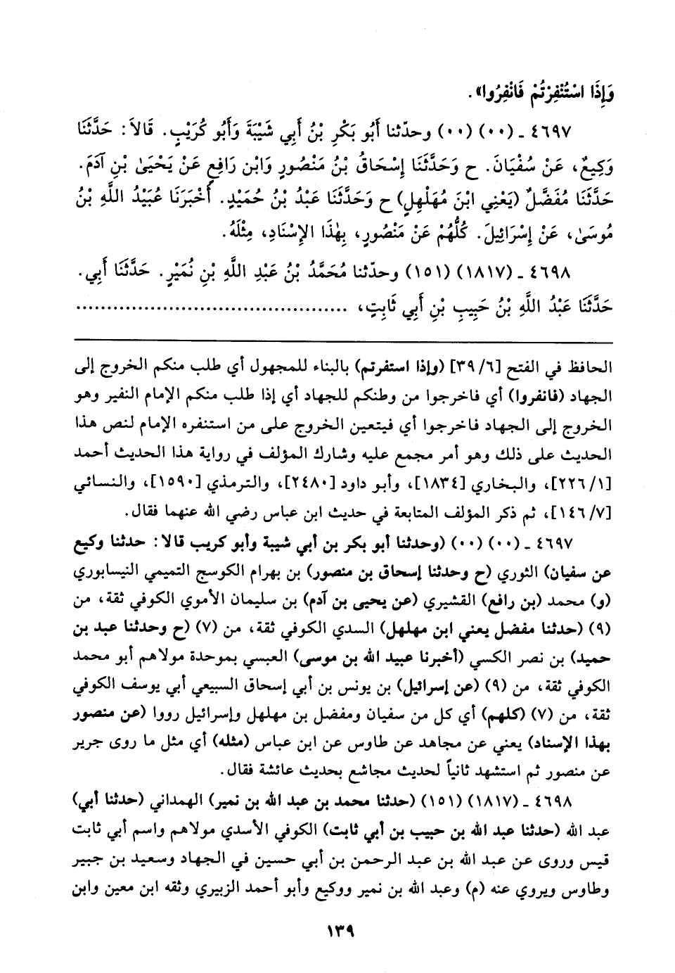 ٤٦٩٨ - (١٨١٧) (١٥١) (حدثنا محمد بن عبد الله بن نمير) الهمداني (حدثنا أبي) عبد الله (حدثنا عبد الله بن حبيب بن أبي ثابت) الكوفي الأسدي مولاهم واسم أبي ثابت قيس وروى عن عبد الله بن عبد الرحمن بن أبي حسين في الجهاد وسعيد بن جبير وطاوس ويروي عنه (م) وعبد الله بن نمير ووكيع وأبو أحمد الزبيري وثقه ابن معين وابن