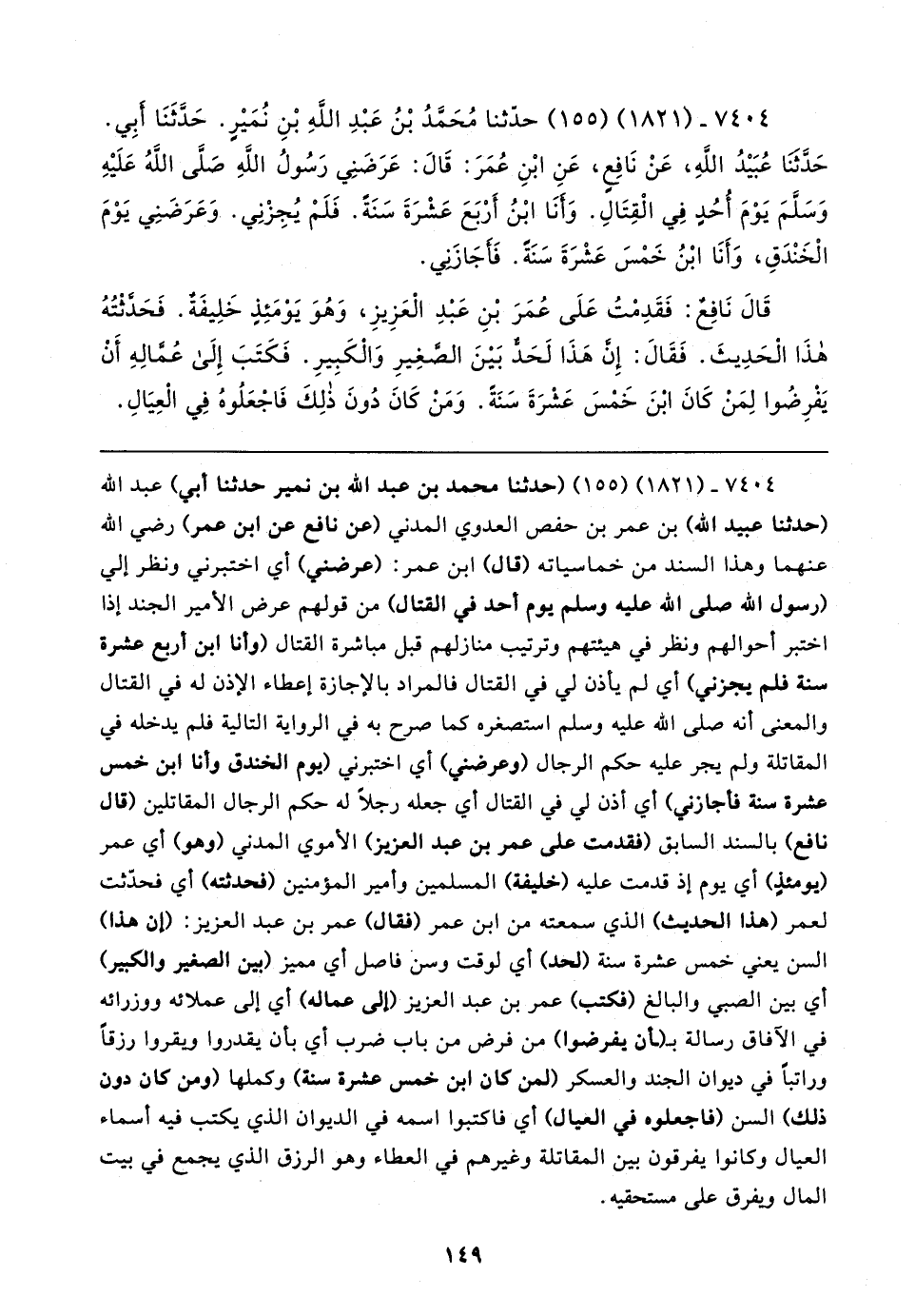 ٧٤٠٤ - (١٨٢١) (١٥٥) حدَّثنا مُحَمَّدُ بْنُ عَبْدِ اللَّهِ بْنِ نُمَيرٍ. حَدَّثَنَا أَبِي. حَدَّثنَا عُبَيدُ اللهِ، عَنْ نَافِعٍ، عَنِ ابْنِ عُمَرَ: قَال: عَرَضَنِي رَسُولُ اللهِ صَلَّى اللهُ عَلَيهِ وَسَلَّمَ يَوْمَ أُحُدٍ فِي الْقِتَالِ. وَأَنَا ابْنُ أَرْبَعَ عَشْرَةَ سَنَةً. فَلَمْ يُجِزْنِي. وَعَرَضَنِي يَوْمَ الْخَنْدَقِ، وَأَنَا ابْنُ خَمْسَ عَشْرَةَ سَنَةً. فَأَجَازَنِي.