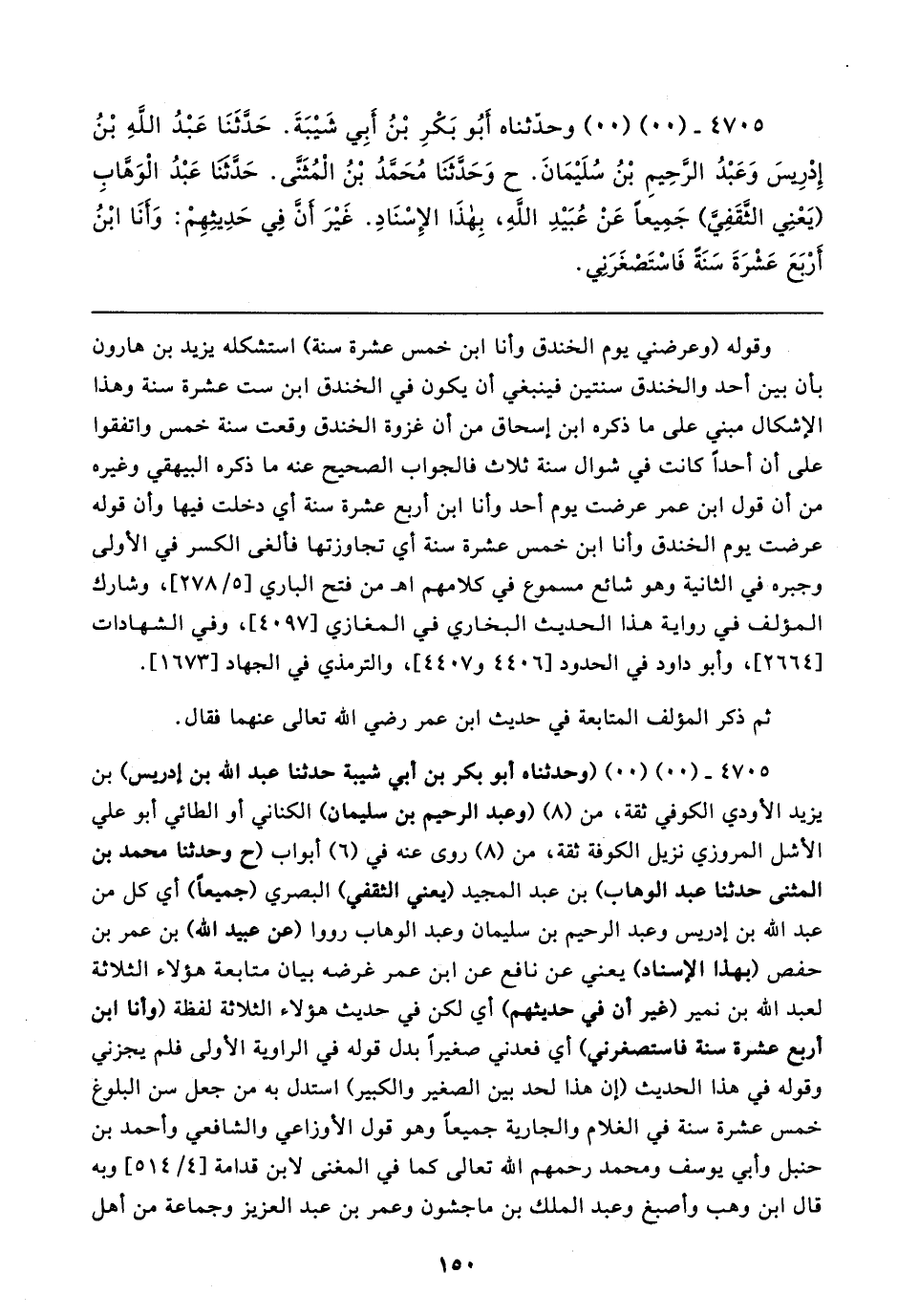 ٤٧٠٥ - (٠٠) (٠٠) وحدّثناه أَبُو بَكْرٍ بْنُ أَبِي شَيبَةَ. حَدَّثَنَا عَبْدُ اللهِ بْنُ إِدْرِيسَ وَعَبْدُ الرَّحِيمِ بْنُ سُلَيمَانَ. ح وَحَدَّثنَا مُحَمَّدُ بْنُ الْمُثَنَّى. حَدَّثنَا عَبْدُ الْوَهَّابِ (يَعْنِي الثَّقَفِيَّ) جَمِيعًا عَنْ عُبَيدِ اللهِ، بِهذَا الإِسْنَادِ. غَيرَ أَنَّ فِي حَدِيثِهِمْ: وَأَنَا ابْنُ أَرْبَعَ عَشْرَةَ سَنَةً فَاسْتَصْغَرَنِي