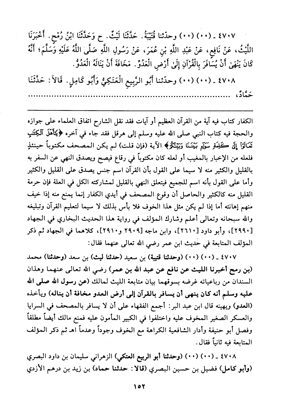 ٤٧٠٧ - (٠٠) (٠٠) (وحدثنا قتيبة) بن سعيد (حدثنا ليث) بن سعد (وحدثنا) محمد (بن رمح أخبرنا الليث عن نافع عن عبد الله بن عمر) رضي الله تعالى عنهما وهذان السندان من رباعياته غرضه بسوقهما بيان متابعة الليث لمالك (عن رسول الله على الله عليه وسلم أنه كان ينهى أن يسافر بالقرآن إلى أرض العدو مخافة أن يناله) ويأخذه (العدو) ويهينه قال ابن عبد البر: أجمع الفقهاء على أن لا يسافر بالمصحف في السرايا والعسكر الصغير المخوف عليه واختلفوا في الكبير المأمون عليه فمنع مالك أيضًا مطلقًا وفصل أبو حنيفة وأدار الشافعية الكراهة مع الخوف وجودًا وعدمًا اهـ ثم ذكر المؤلف المتابعة فيه ثانيًا فقال.