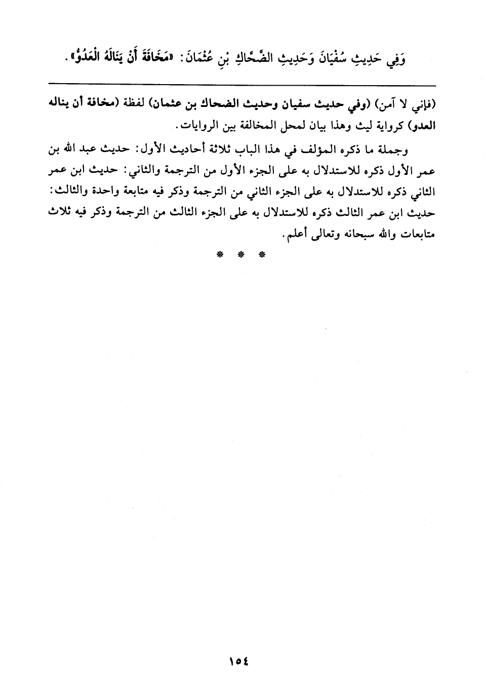 (فإني لا آمن) (وفي حديث سفيان وحديث الضحاك بن عثمان) لفظة (مخافة أن يناله العدو) كرواية ليث وهذا بيان قال المخالفة بين الروايات.