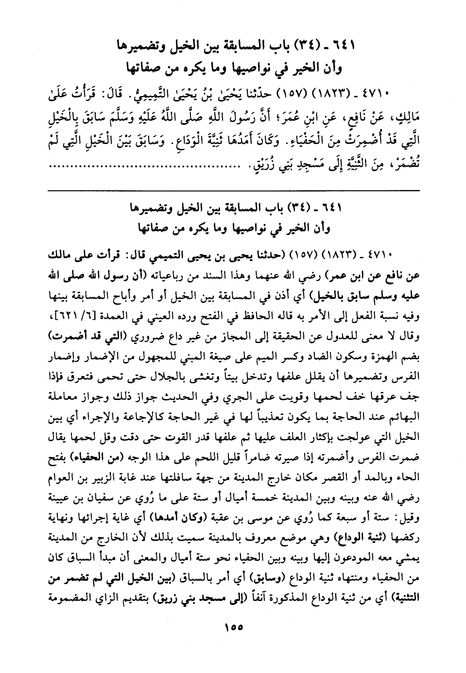 ٤٧١٠ - (١٨٢٣) (١٥٧) (حدثنا يحيى بن يحيى التميمي قال: قرأت على مالك عن نافع عن ابن عمر) رضي الله عنهما وهذا السند من رباعياته (أن رسول الله صلى الله عليه وسلم سابق بالخيل) أي أذن في المسابقة بين الخيل أو أمر وأباح المسابقة بينها وفيه نسبة الفعل إلى الأمر به قاله الحافظ في الفتح ورده العيني في العمدة [٦/ ٦٢١]، وقال لا معنى للعدول عن الحقيقة إلى المجاز من غير داع ضروري (التي قد أضمرت) بضم الهمزة وسكون الضاد وكسر الميم على صيغة المبني للمجهول من الإضمار وإضمار الفرس وتضميرها أن يقلل علفها وتدخل بيتًا وتغشى بالجلال حتى تحمى فتعرق فإذا جف عرقها خف لحمها وقويت على الجري وفي الحديث جواز ذلك وجواز معاملة البهائم عند الحاجة بما يكون تعذيبًا لها في غير الحاجة كالإجاعة والإجراء أي بين الخيل التي عولجت بإكثار العلف عليها ثم علفها قدر القوت حتى دقت وقل لحمها يقال ضمرت الفرس وأضمرته إذا صيرته ضامرًا قليل اللحم على هذا الوجه (من الحفياء) بفتح الحاء وبالمد أو القصر مكان خارج المدينة من جهة سافلتها عند غابة الزبير بن العوام رضي الله عنه وبينه وبين المدينة خمسة أميال أو ستة على ما رُوي عن سفيان بن عيينة وقيل: ستة أو سبعة كما رُوي عن موسى بن عقبة (وكان أمدها) أي غاية إجرائها ونهاية ركضها (ثنية الوداع) وهي موضع معروف بالمدينة سميت بذلك لأن الخارج من المدينة يمشي معه المودعون إليها وبينه وبين الحفياء نحو ستة أميال والمعنى أن مبدأ السباق كان من الحفياء ومنتهاه ثنية الوداع (وسابق) أي أمر بالسباق (بين الخيل التي لم تضمر من التثنية) أي من ثنية الوداع المذكورة آنفًا (إلى مسجد بني زريق) بتقديم الزاي المضمومة