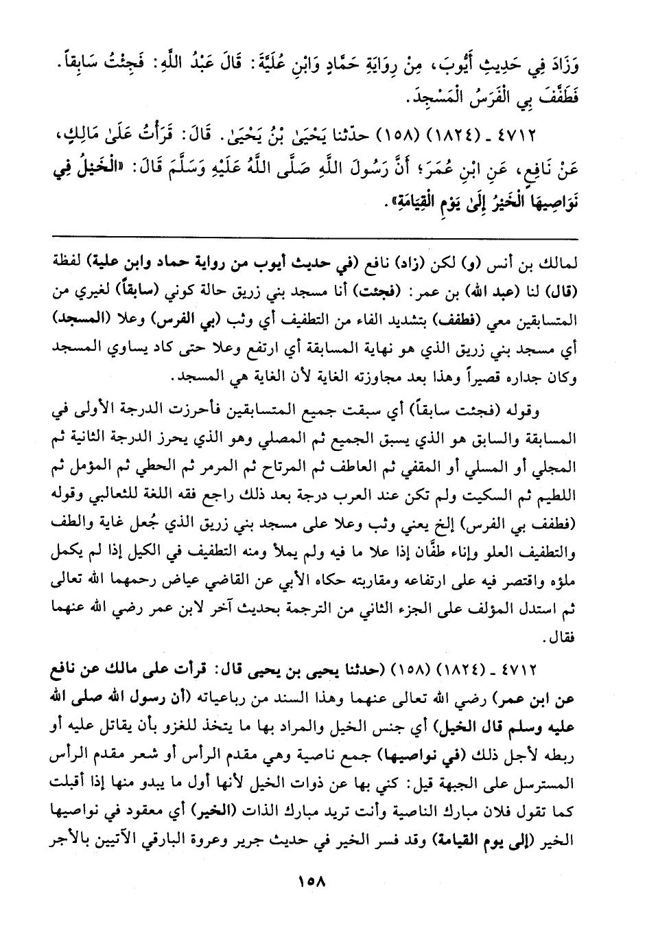 ٤٧١٢ - (١٨٢٤) (١٥٨) حدّثثا يَحْيَى بْنُ يَحْيَى. قَال: قَرَأْتُ عَلَى مَالِكٍ، عَنْ نَافِعٍ، عَنِ ابْنِ عُمَرَ؛ أَنَّ رَسُولَ الله صَلَّى اللَّهُ عَلَيهِ وَسَلَّمَ قَال: "الْخَيلُ فِي نَوَاصِيهَا الْخَيرُ إِلَى يَوْمِ الْقِيَامَةِ"