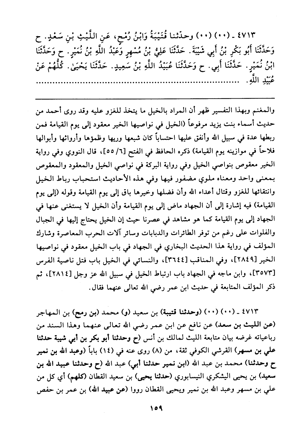 والمغنم وبهذا التفسير ظهر أن المراد بالخيل ما يتخذ للغزو عليه وقد روى أحمد من حديث أسماء بنت يزيد مرفوعًا (الخيل في نواصيها الخير معقود إلى يوم القيامة فمن ربطها عدة في سبيل الله وأنفق عليها احتسابًا كان شبعها وريها وظمؤها وأرواثها وأبو الها فلاحًا في موازينه يوم القيامة) ذكره الحافظ في الفتح [٦/ ٥٥]، قال النووي وفي رواية الخير معقوص بنواصي الخيل وفي رواية البركة في نواصي الخيل والمعقود والمعقوص بمعنى واحد ومعناه ملوي مضفور فيها وفي هذه الأحاديث استحباب رباط الخيل وانتقائها للغزو وقتال أعداء الله وأن فضلها وخيرها باق إلى يوم القيامة وقوله (إلى يوم القيامة) فيه إشارة إلى أن الجهاد ماض إلى يوم القيامة وأن الخيل لا يستغنى عنها في الجهاد إلى يوم القيامة كما هو مشاهد في عصرنا حيث إن الخيل يحتاج إليها في الجبال والفلوات على رغم من توفر الطائرات والدبابات وسائر آلات الحرب المعاصرة وشارك المؤلف في رواية هذا الحديث البخاري في الجهاد في باب الخيل معقود في نواصيها الخير [٢٨٤٩]، وفي المناقب [٣٦٤٤]، والنسائي في الخيل باب فتل ناصية الفرس [٣٥٧٣]، وابن ماجه في الجهاد باب ارتباط الخيل في سبيل الله عزَّ وجلَّ [٢٨١٤]، ثم ذكر المؤلف المتابعة في حديث ابن عمر رضي الله تعالى عنهما فقال.