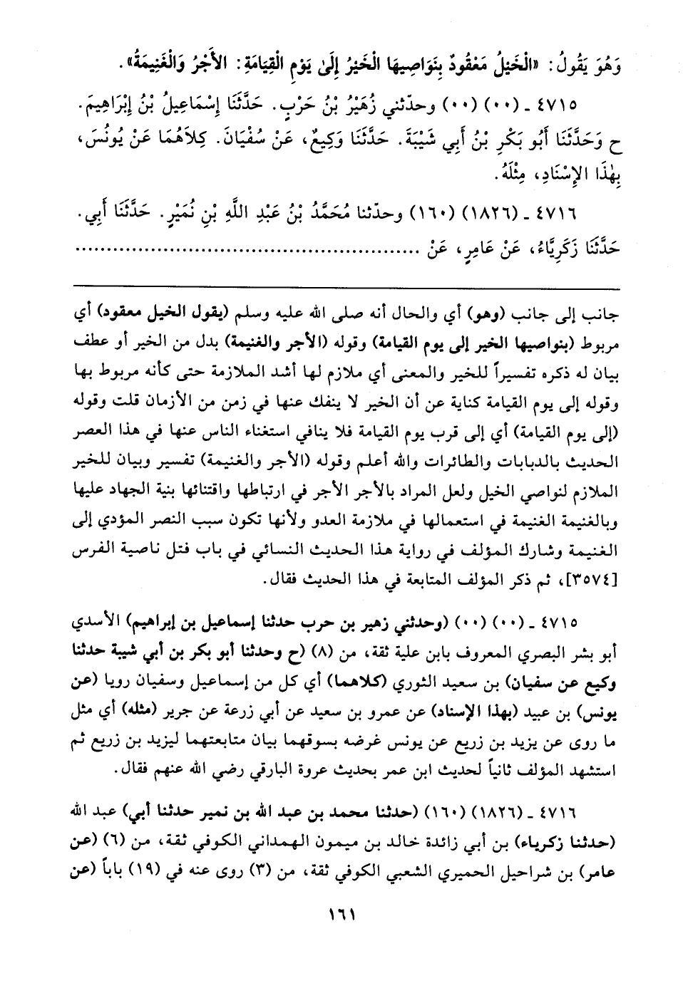 ٤٧١٥ - (٠٠) (٠٠) (وحدثني زهير بن حرب حدثنا إسماعيل بن إبراهيم) الأسدي أبو بشر البصري المعروف بابن علية ثقة، من (٨) (ح وحدثنا أبو بكر بن أبي شيبة حدثنا وكيع عن سفيان) بن سعيد الثوري (كلاهما) أي كل من إسماعيل وسفيان رويا (عن يونس) بن عبيد (بهذا الإسناد) عن عمرو بن سعيد عن أبي زرعة عن جرير (مثله) أي مثل ما روى عن يزيد بن زريع عن يونس غرضه بسوقهما بيان متابعتهما ليزيد بن زريع ثم استشهد المؤلف ثانيًا لحديث ابن عمر بحديث عروة البارقي رضي الله عنهم فقال.