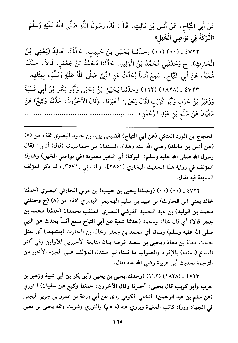 عَنْ أَبِي التَّيَّاحِ، عَنْ أَنَسِ بْنِ مَالِكٍ. قَال: قَال رَسُولُ الله صَلَّى الله عَلَيهِ وَسَلَّمَ: "الْبَرَكَةُ فِي نَوَاصِي الْخَيلِ".